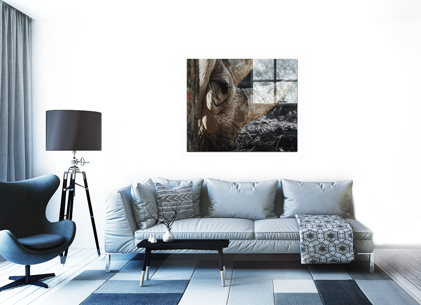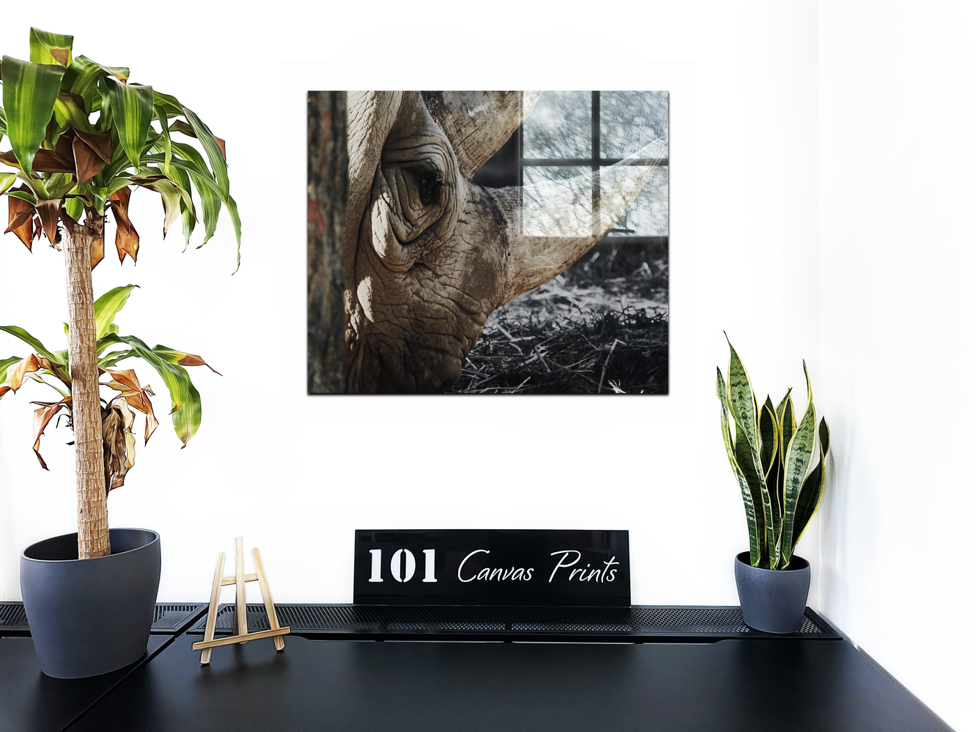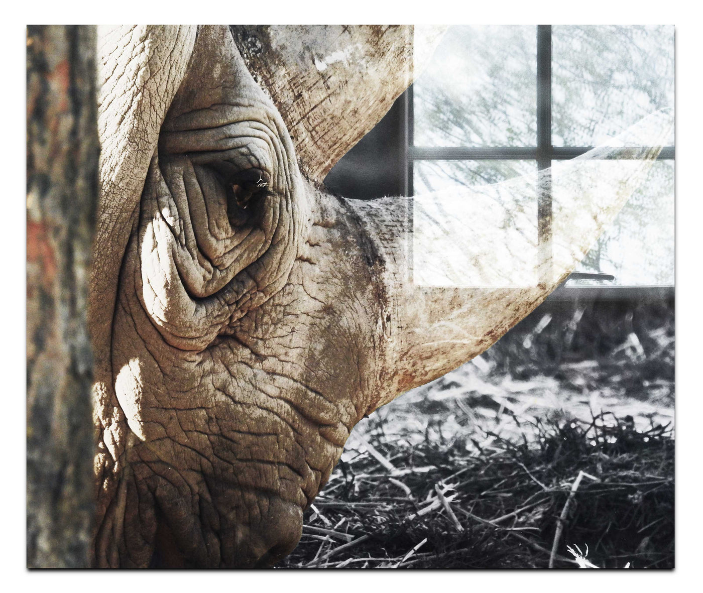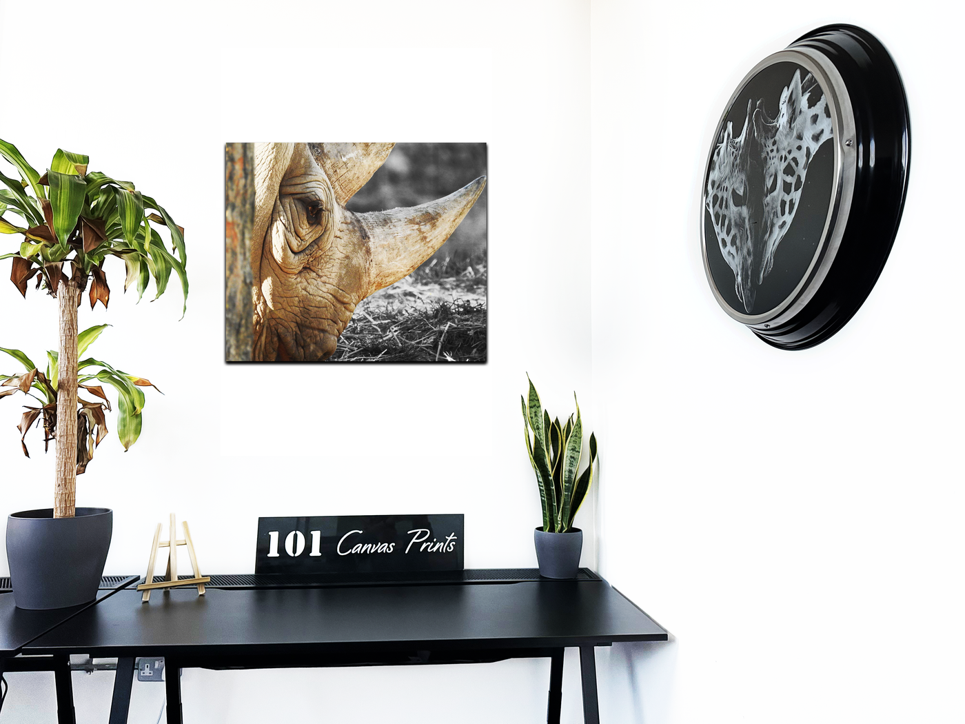A side profile of an adult White Rhino against a black and white desaturated background. This print is perfect for any animal lover. The artwork is printed on high quality print material and face mounted via lamination onto Acrylic
