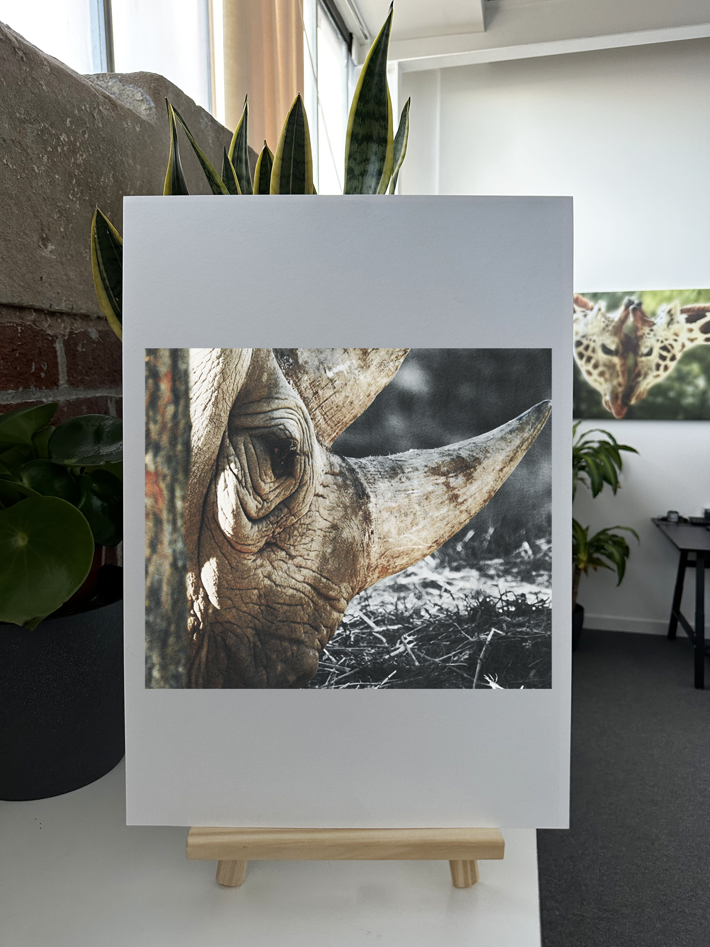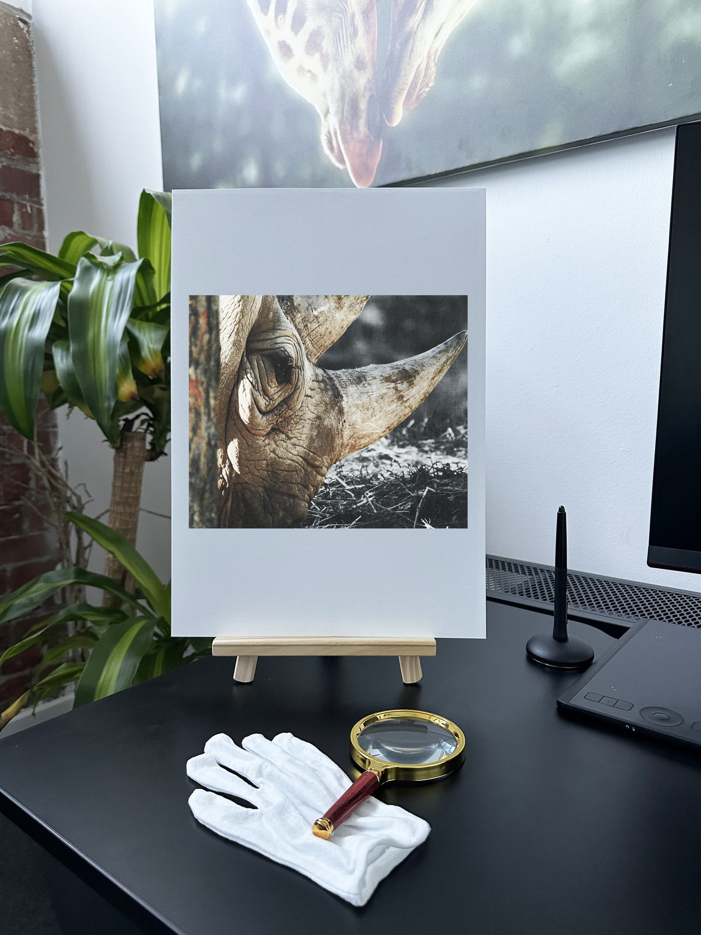 A side profile of an adult White Rhino against a black and white desaturated background. This print is perfect for any animal lover. The artwork is printed on high quality Fine Art paper using archival inks.