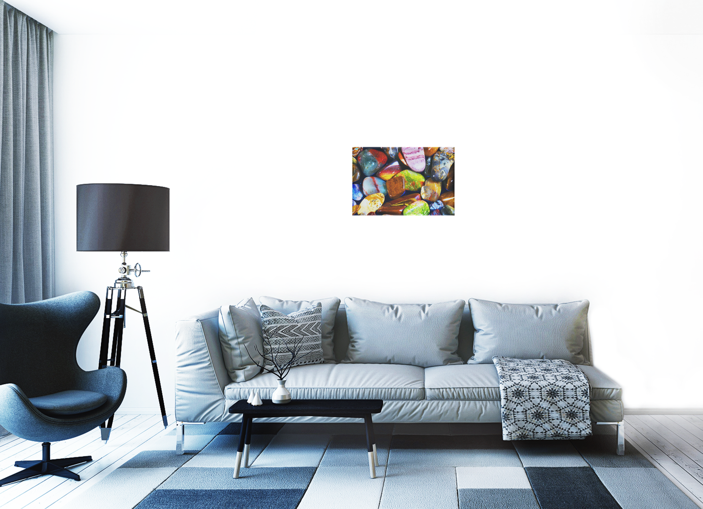 The lighting in this piece is expertly crafted, allowing each stone to reveal its unique character. Soft reflections dance across the polished surfaces, emphasising the stones' smooth textures and internal patterns. The varied shapes and sizes of the pebbles create an engaging interplay of forms, inviting the viewer's eye to meander across the Canvas, discovering new details with each glance.