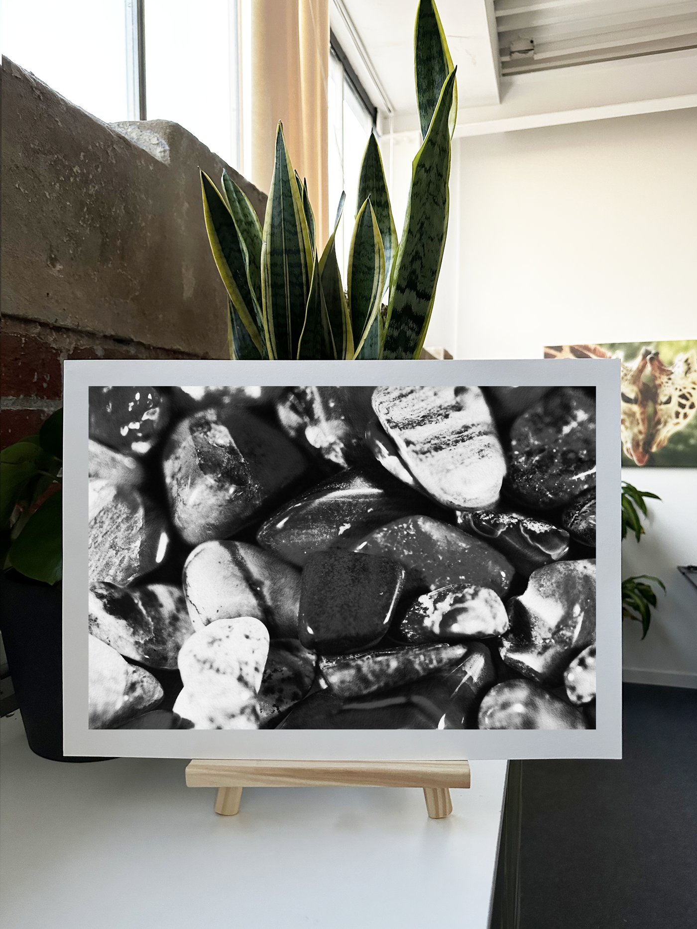 This captivating Monochrome Fine Art print showcases a stunning array of polished stones, each one a testament to the Earth's geological diversity. The composition fills the frame with an assortment of smooth, tumbled pebbles, creating a mesmerising tapestry of Monochromatic tonality and form. From rich white and vibrant greys to warm dark tones, the variety of hues is truly astounding.