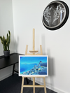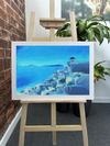 The artist's chosen palette is a symphony of blues, from deep cobalt to ethereal turquoise, perfectly capturing the merging of sea and sky that defines the Aegean horizon. Subtle touches of yellow and white add warmth and dimension, while providing striking contrast against the predominant blue tones. Our photography team have carefully preserved the delicate brushwork that creates texture in the sky and sea, while maintaining the crisp architectural details that give the scene its distinctive character.