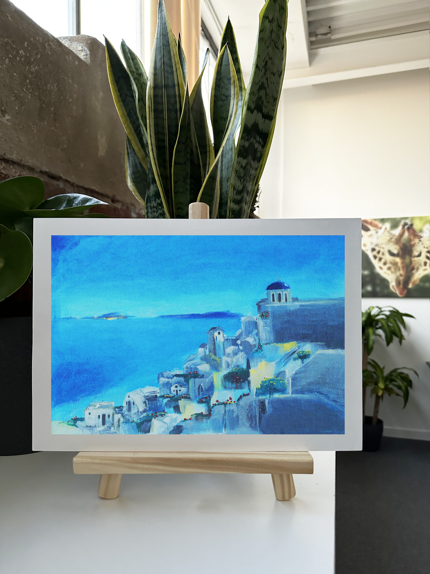 The artist's chosen palette is a symphony of blues, from deep cobalt to ethereal turquoise, perfectly capturing the merging of sea and sky that defines the Aegean horizon. Subtle touches of yellow and white add warmth and dimension, while providing striking contrast against the predominant blue tones. Our photography team have carefully preserved the delicate brushwork that creates texture in the sky and sea, while maintaining the crisp architectural details that give the scene its distinctive character.