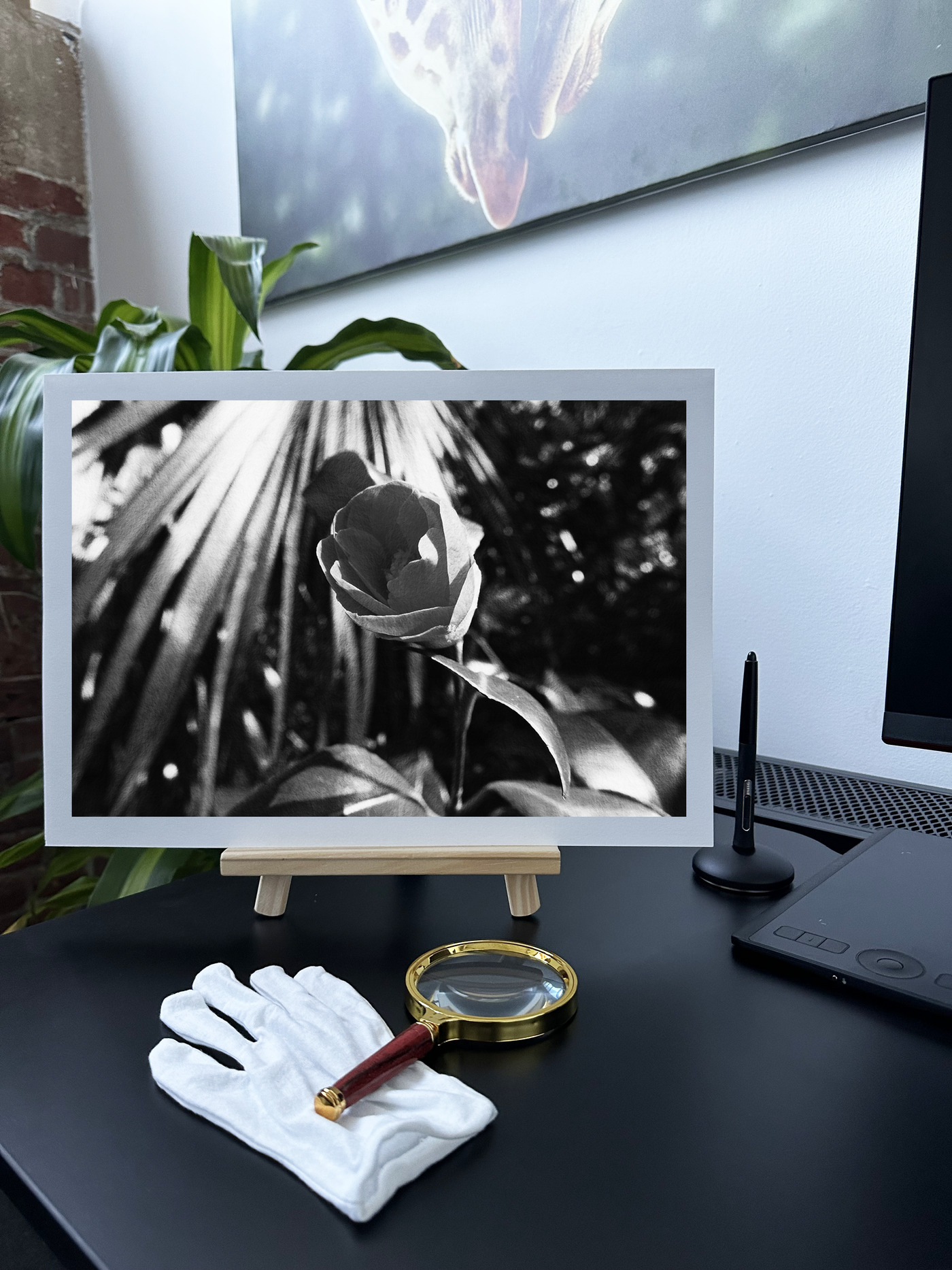 Our carefully handmade monochrome fine art prints are produced on Hahnemühle 308 matte cotton rag paper using Epson archival inks for exceptional detail and color accuracy. Each print features clean, precise edges and a textured surface that brings depth and richness to your chosen artwork, creating a gallery-worthy presentation.