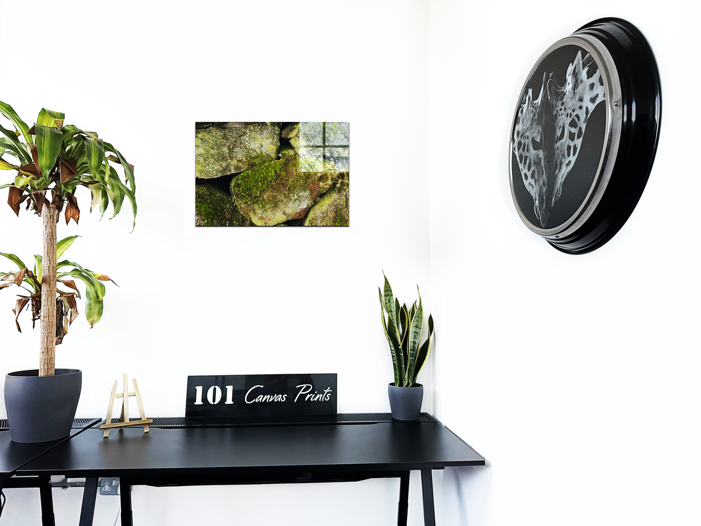 The colour scheme is a nuanced interplay between the muted tones of stone and the vibrant hues of living plants. The rocks provide an Acrylic print of greys, browns, and subtle earth tones, their surfaces mottled with the patina of age. This backdrop is brought to life by the verdant greens of the moss, ranging from delicate, almost translucent new growth to the rich, deep green of established patches. Lichens add subtle variations in colour and texture, creating a complex and visually engaging surface.