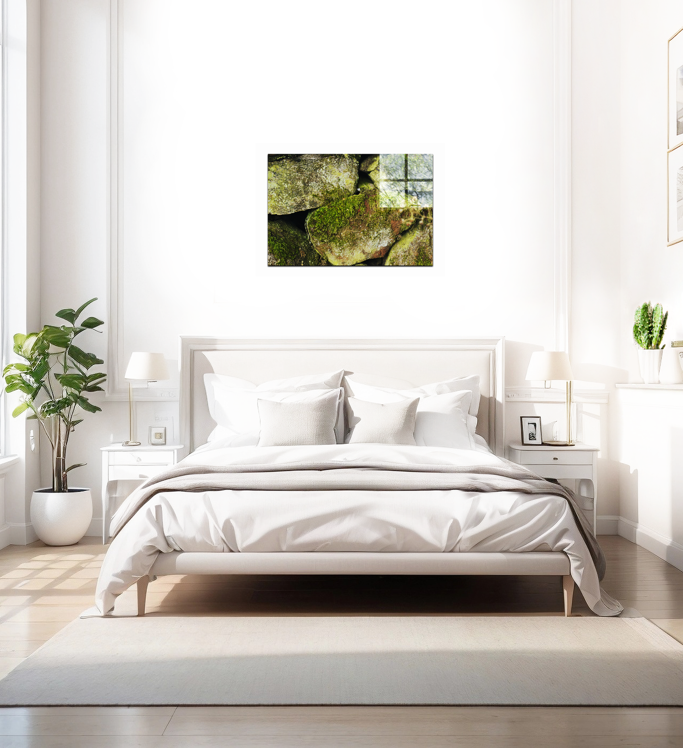When produced as an acrylic-set print, this image takes on a new dimension of depth and vibrancy. The high-gloss finish of the Acrylic enhances the lush greens of the moss, making them appear almost luminous against the more subdued tones of the stones. The sheen of the Acrylic also accentuates the perceived moisture in the scene, as if the moss has just been kissed by morning dew. This medium adds a sense of depth to the image, enhancing the three-dimensional quality of the stones and creating the illusion that one could reach out and feel the soft, damp moss.