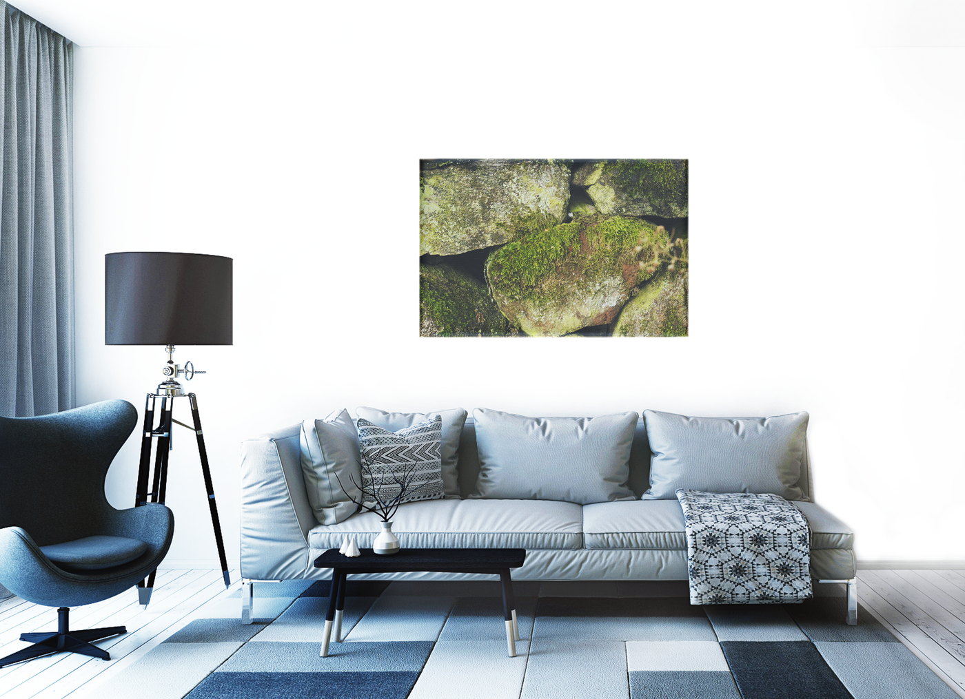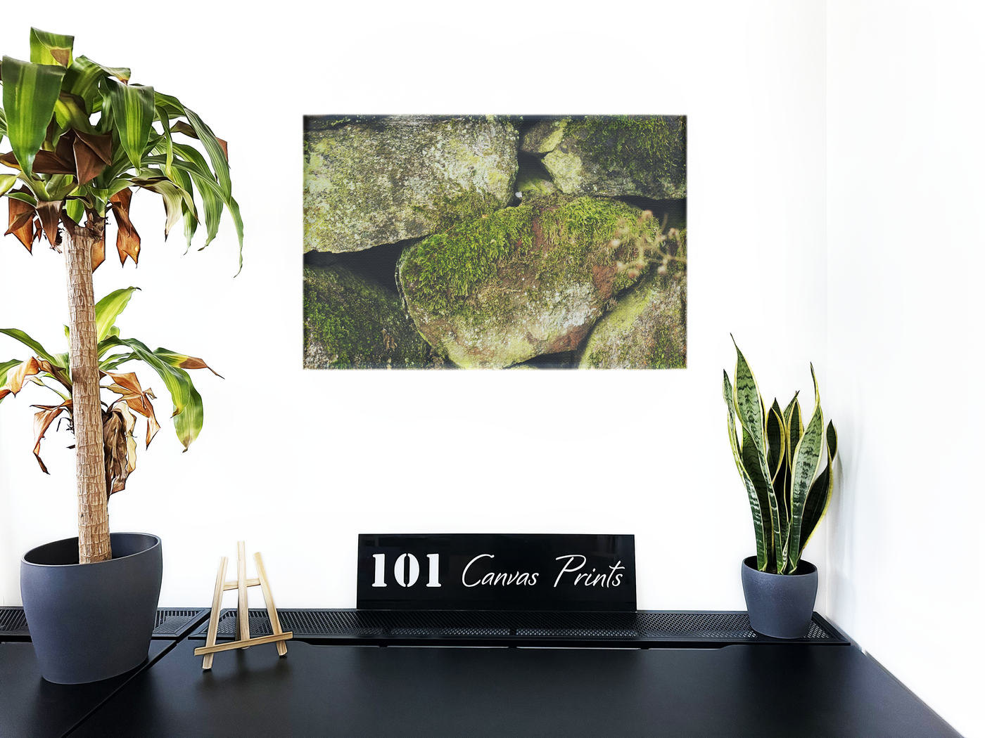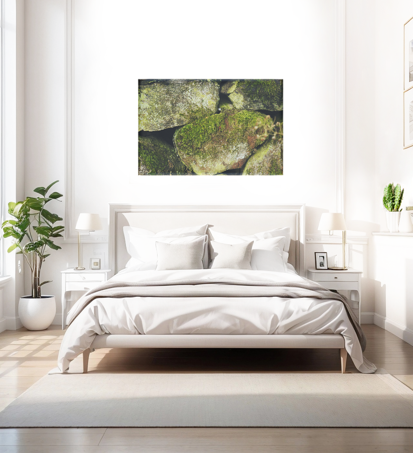 On Canvas, this image takes on a remarkable tactile quality. The natural texture of the Canvas print complements the organic subject matter, enhancing the perceived softness of the moss and the rugged texture of the stones. The matte finish of the Canvas softens the contrasts slightly, creating a serene, almost meditative atmosphere that invites contemplation. This print would be an excellent addition to a nature-inspired interior, bringing a touch of forest tranquillity to any space. It could serve as a calming focal point in a living room, add a sense of grounding to a home office, or bring a slice of the natural world into an urban apartment.