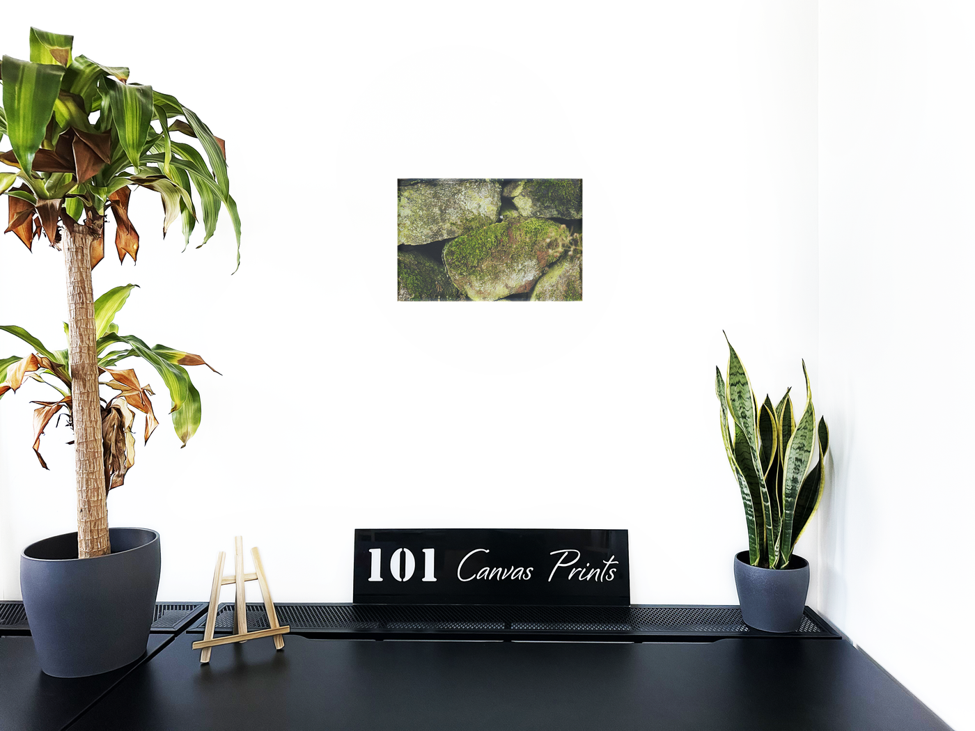 On Canvas, this image takes on a remarkable tactile quality. The natural texture of the Canvas print complements the organic subject matter, enhancing the perceived softness of the moss and the rugged texture of the stones. The matte finish of the Canvas softens the contrasts slightly, creating a serene, almost meditative atmosphere that invites contemplation. This print would be an excellent addition to a nature-inspired interior, bringing a touch of forest tranquillity to any space. It could serve as a calming focal point in a living room, add a sense of grounding to a home office, or bring a slice of the natural world into an urban apartment.