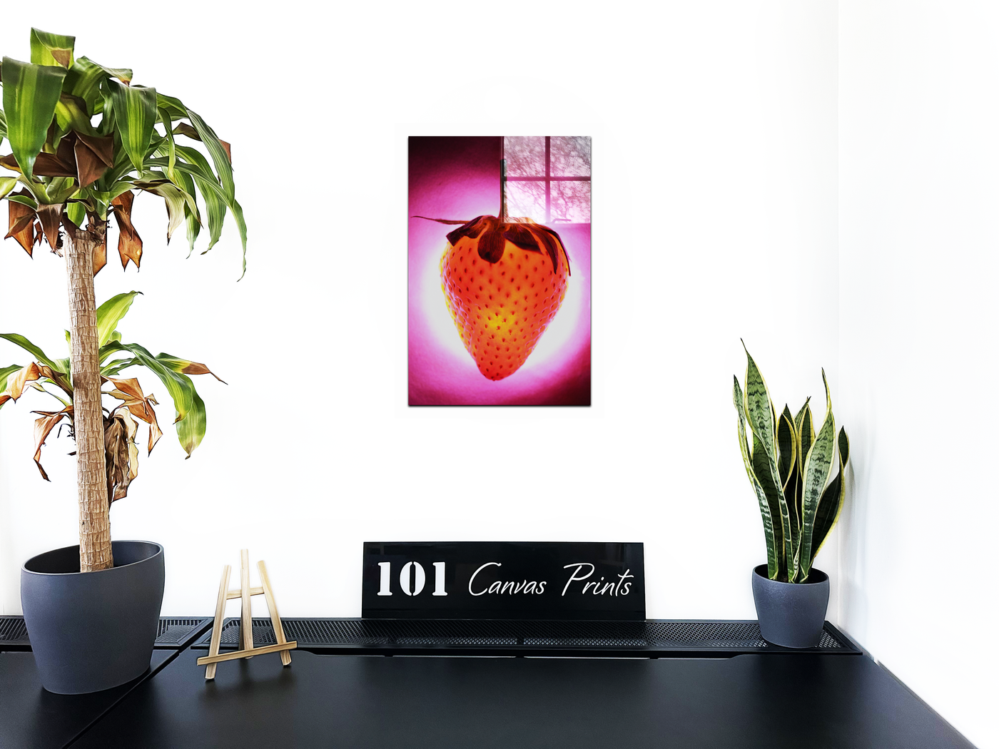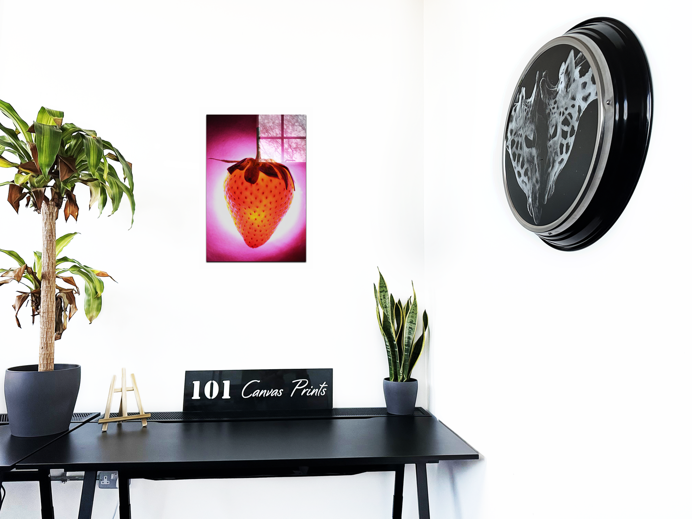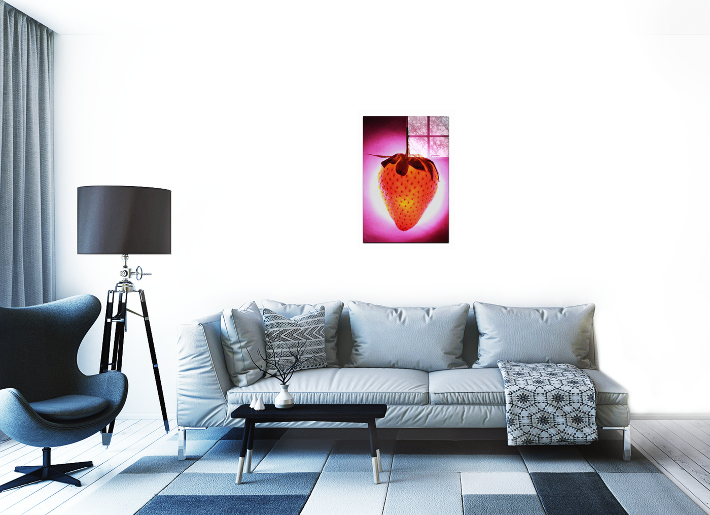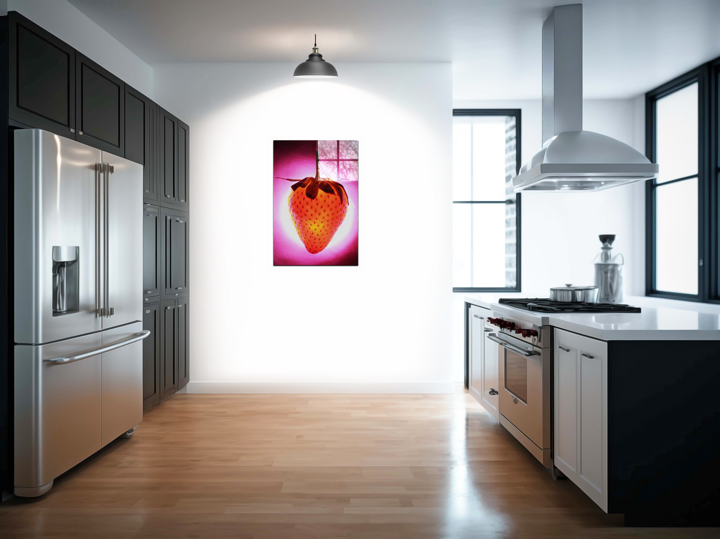 The colour scheme is a harmonious dance between warm and cool tones. The strawberry itself is a rich, appetising red-orange, its surface a Acrylic print of subtle variations in hue. Each tiny seed is clearly visible, adding depth and texture to the fruit's skin. This warmth is dramatically contrasted by the cool pink aura that envelops the strawberry, creating a luminous effect that transforms the entire image into something almost supernatural. The lighting is masterfully crafted, giving the impression that the fruit is glowing from within.