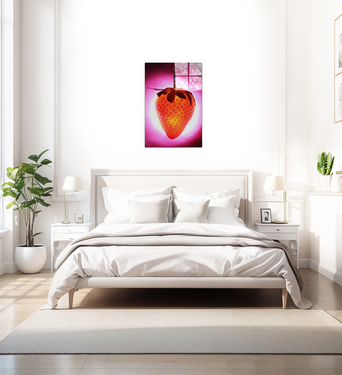 This captivating image presents a solitary strawberry as a work of art, elevating the humble fruit to iconic status. Suspended in a sea of pink light, the strawberry commands attention with its perfect form and vivid colouring. The composition is beautifully simple yet highly effective, allowing the viewer to appreciate every detail of this familiar fruit in an entirely new context.