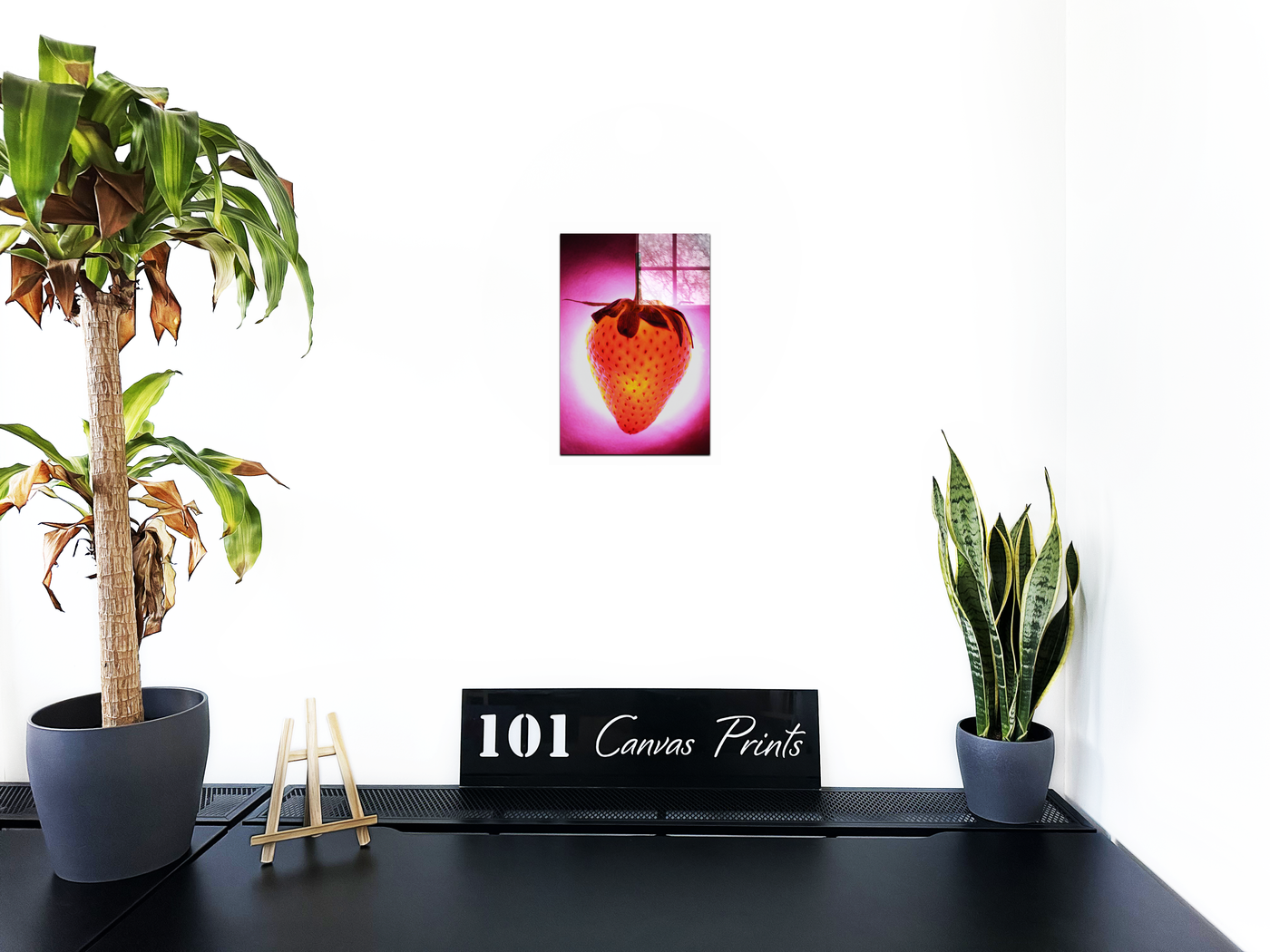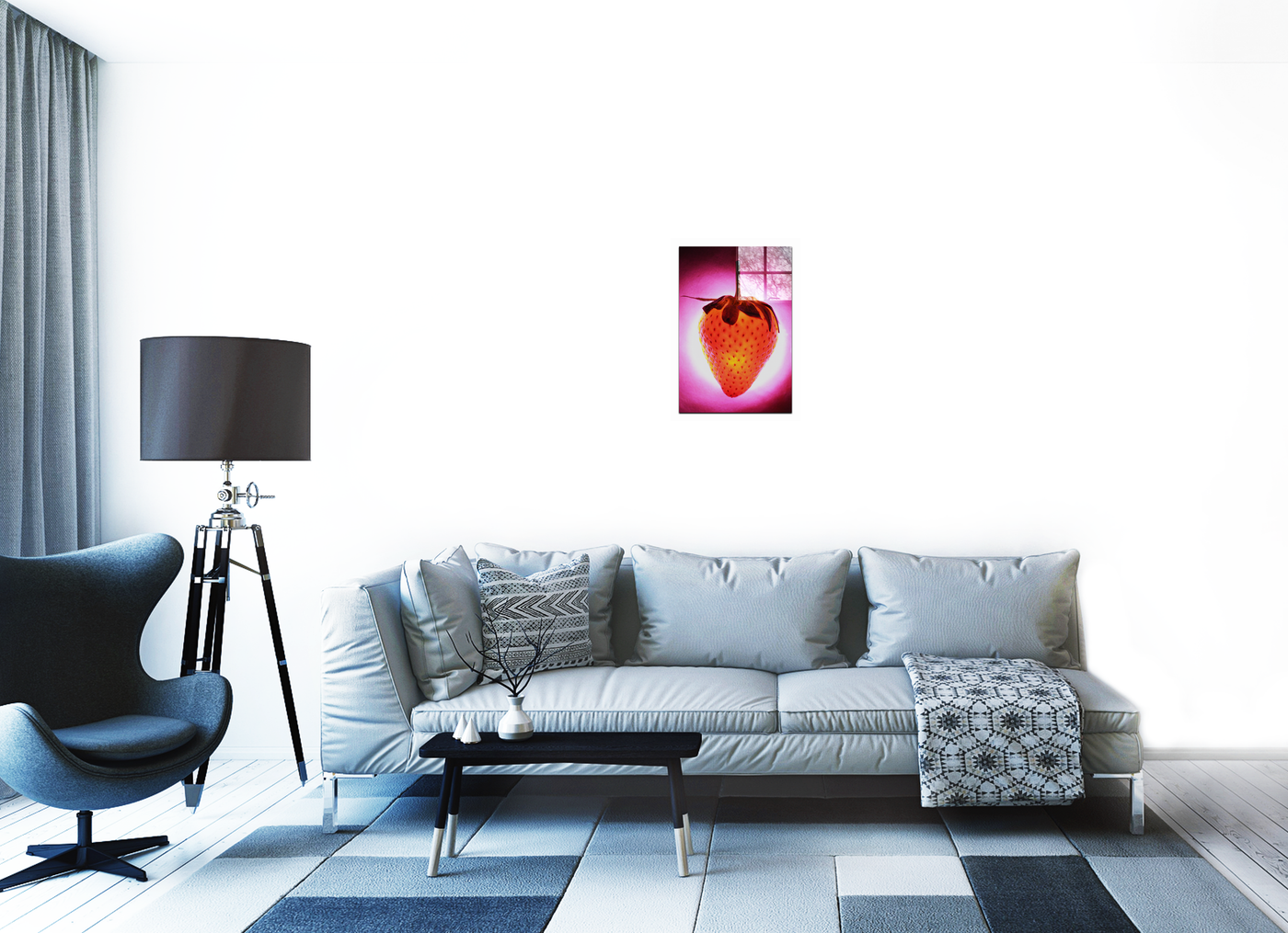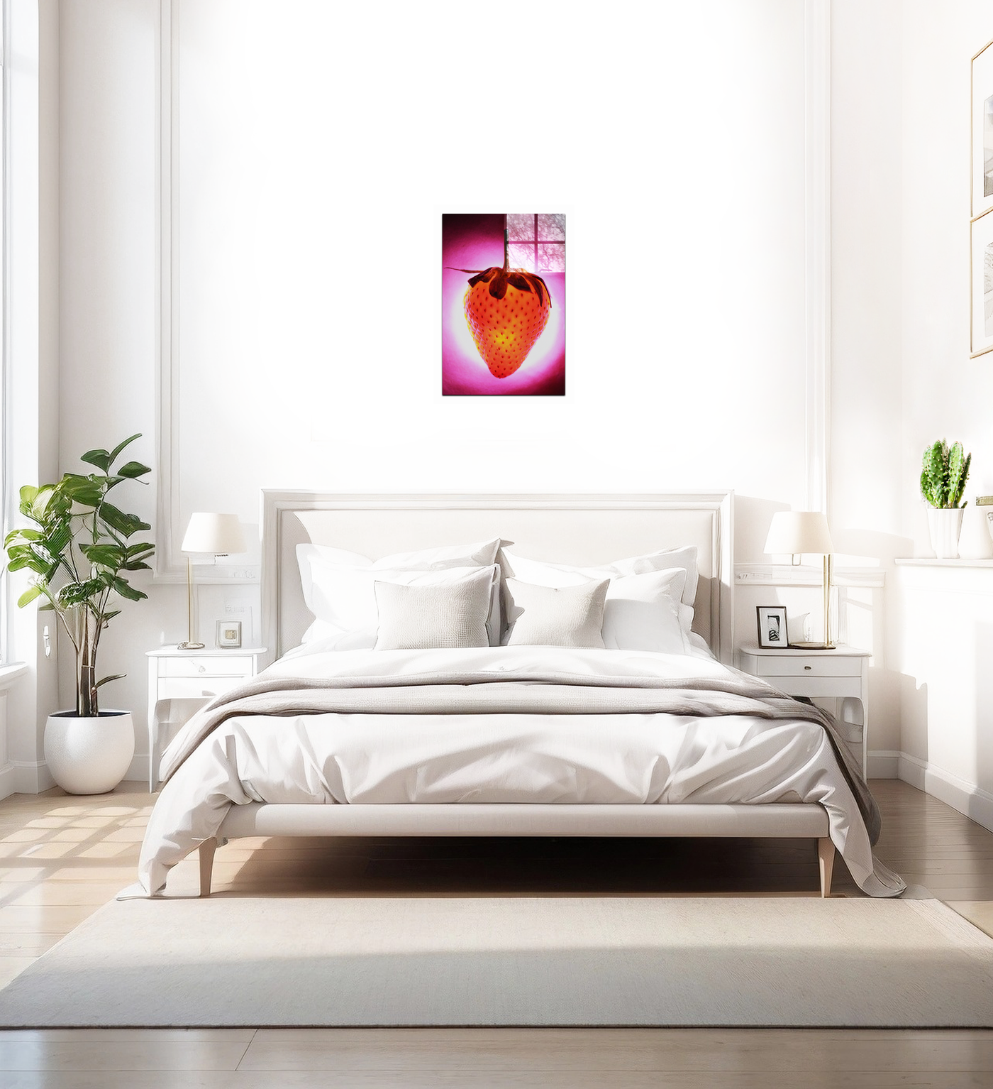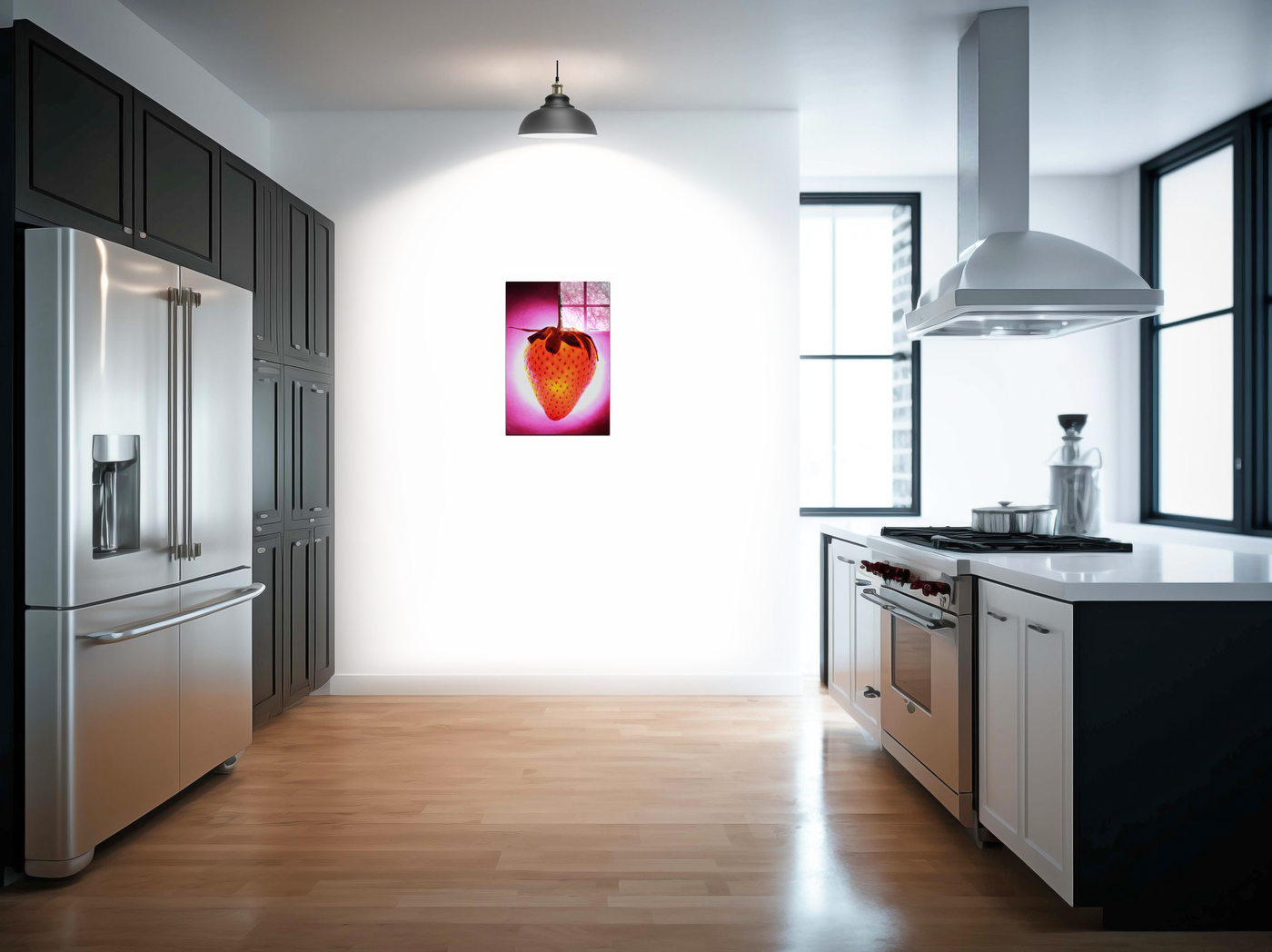 The colour scheme is a harmonious dance between warm and cool tones. The strawberry itself is a rich, appetising red-orange, its surface a Acrylic print of subtle variations in hue. Each tiny seed is clearly visible, adding depth and texture to the fruit's skin. This warmth is dramatically contrasted by the cool pink aura that envelops the strawberry, creating a luminous effect that transforms the entire image into something almost supernatural. The lighting is masterfully crafted, giving the impression that the fruit is glowing from within.