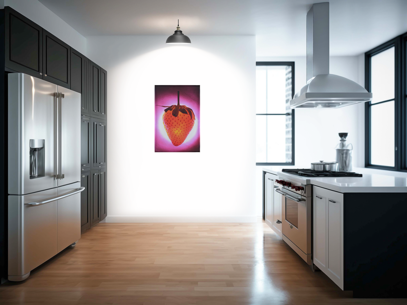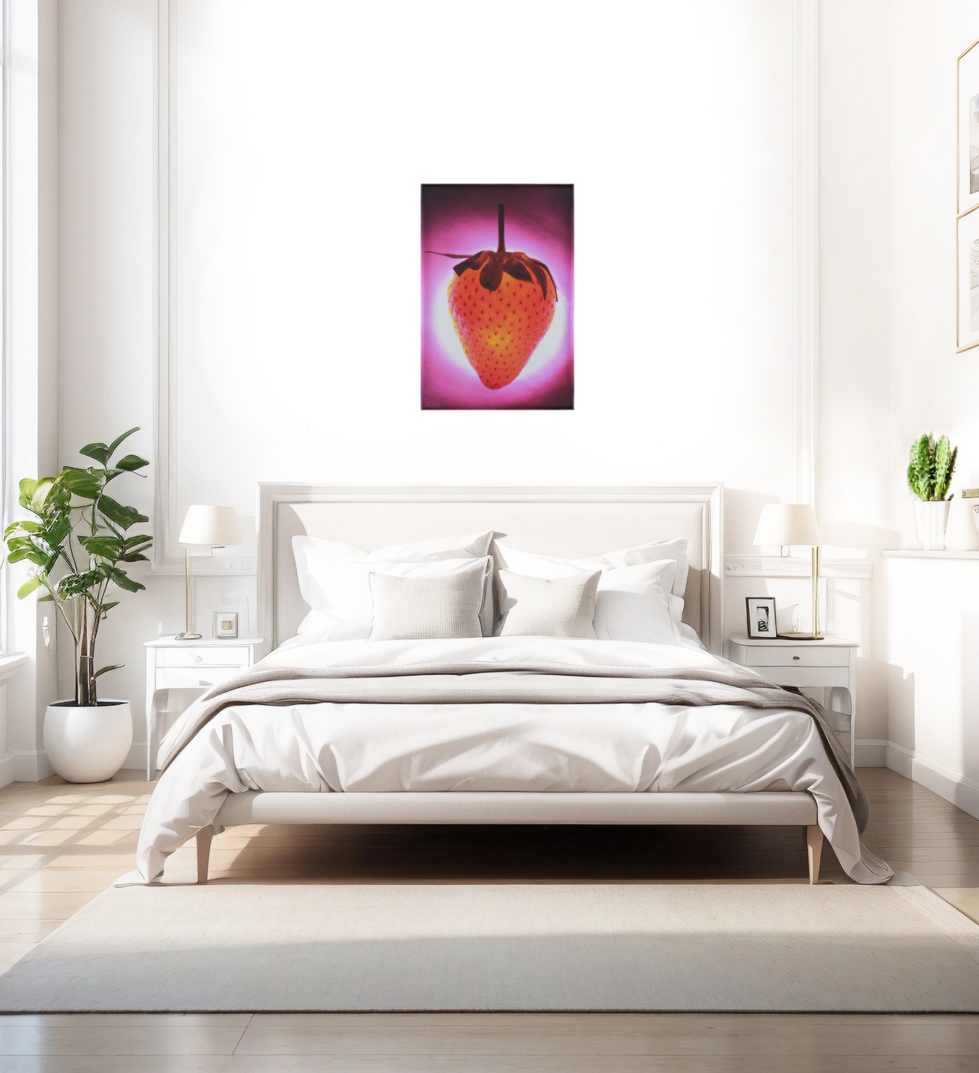 On Canvas, this image takes on a new dimension of tactile appeal. The matte finish of the Canvas print subtly softens the vibrant colours, lending a dreamy quality to the scene that complements the otherworldly lighting. The natural texture of the Canvas echoes the organic subject matter, enhancing the strawberry's seeds and leafy crown. This print would be a stunning focal point in a kitchen or dining area, bringing a pop of colour and a touch of whimsy to the space. It could also serve as an inspiring piece in a studio or office, reminding viewers of the beauty found in everyday objects when seen in a new light.