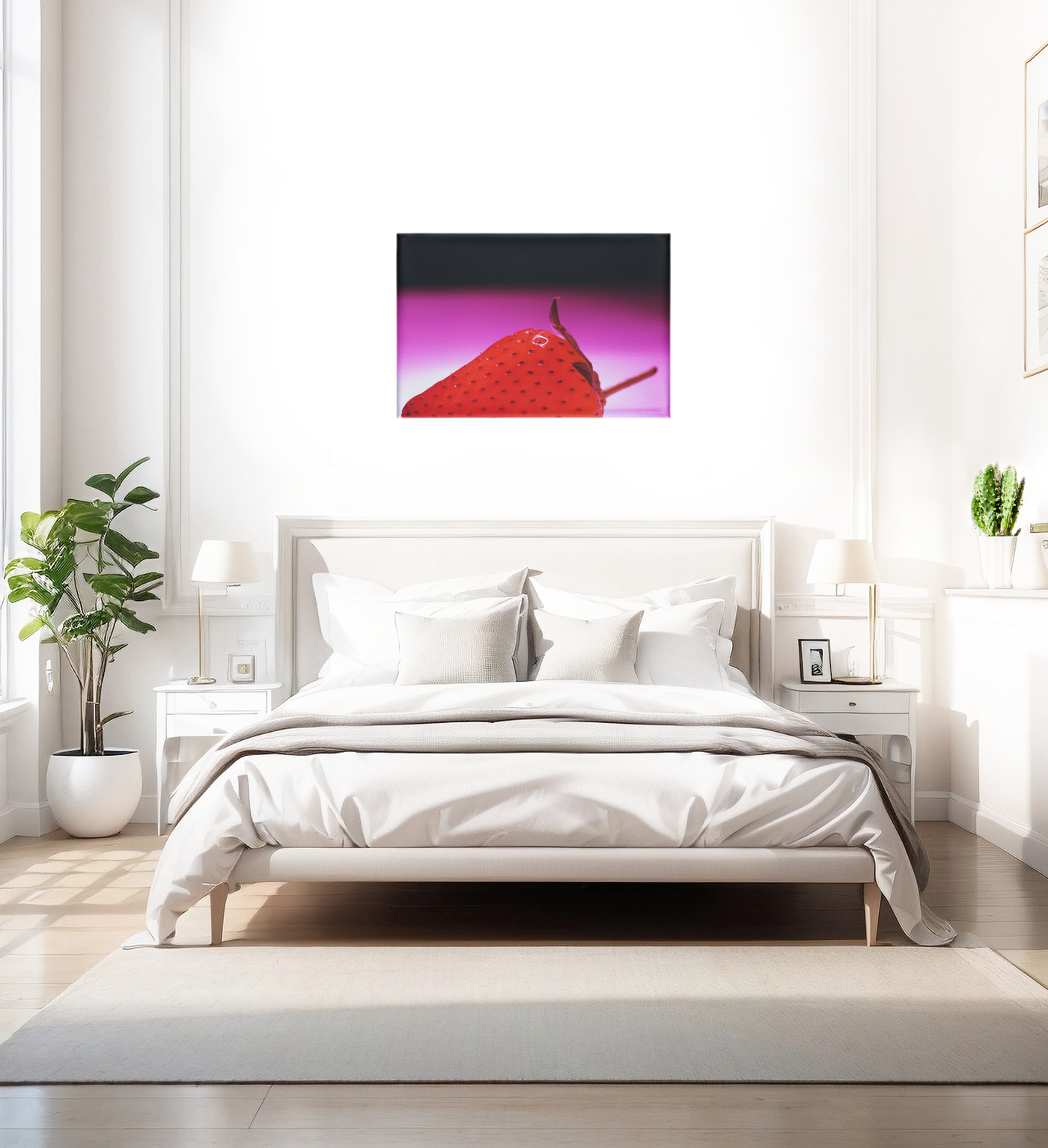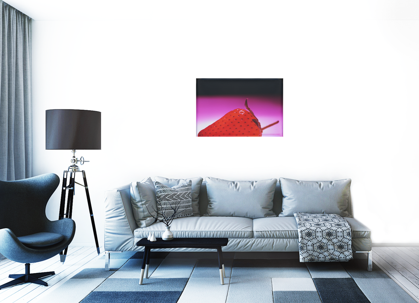 Our photographers have captured this perfect example of a ripe summer strawberry in high definition. This has also created an exceptional shallow depth of field, which allows the backlighting to melt away into an opulent gradient of warm pinks and heavier, regal purples.