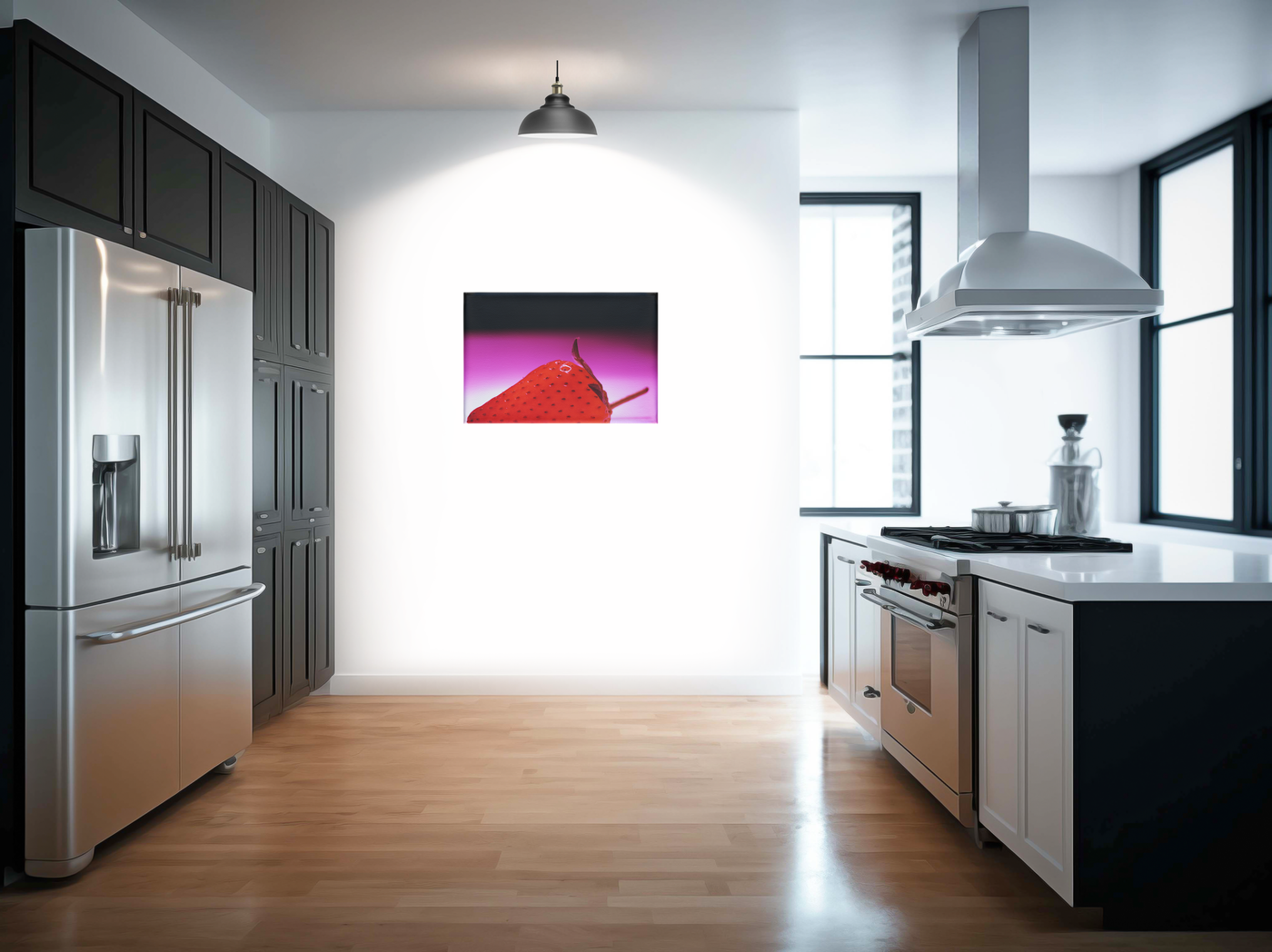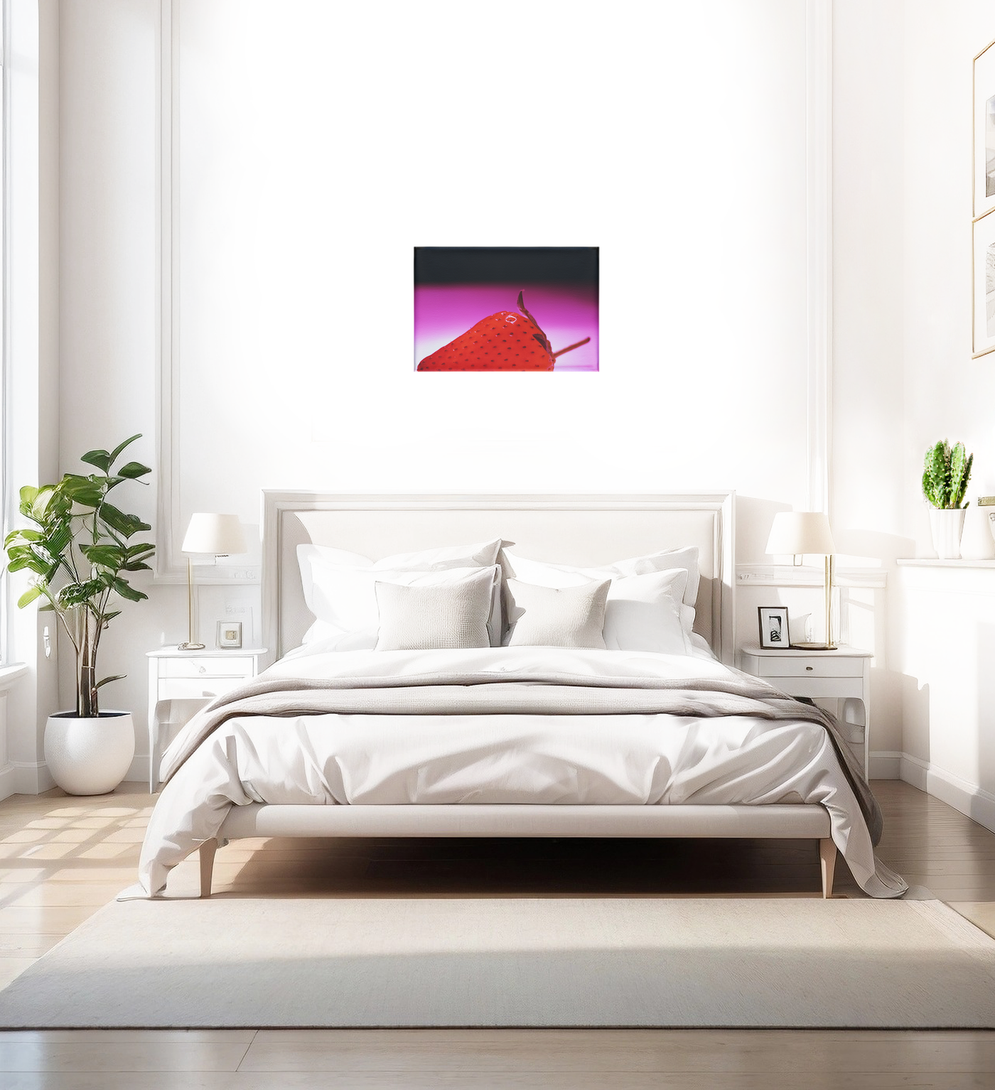 Our photographers have captured this perfect example of a ripe summer strawberry in high definition. This has also created an exceptional shallow depth of field, which allows the backlighting to melt away into an opulent gradient of warm pinks and heavier, regal purples.
