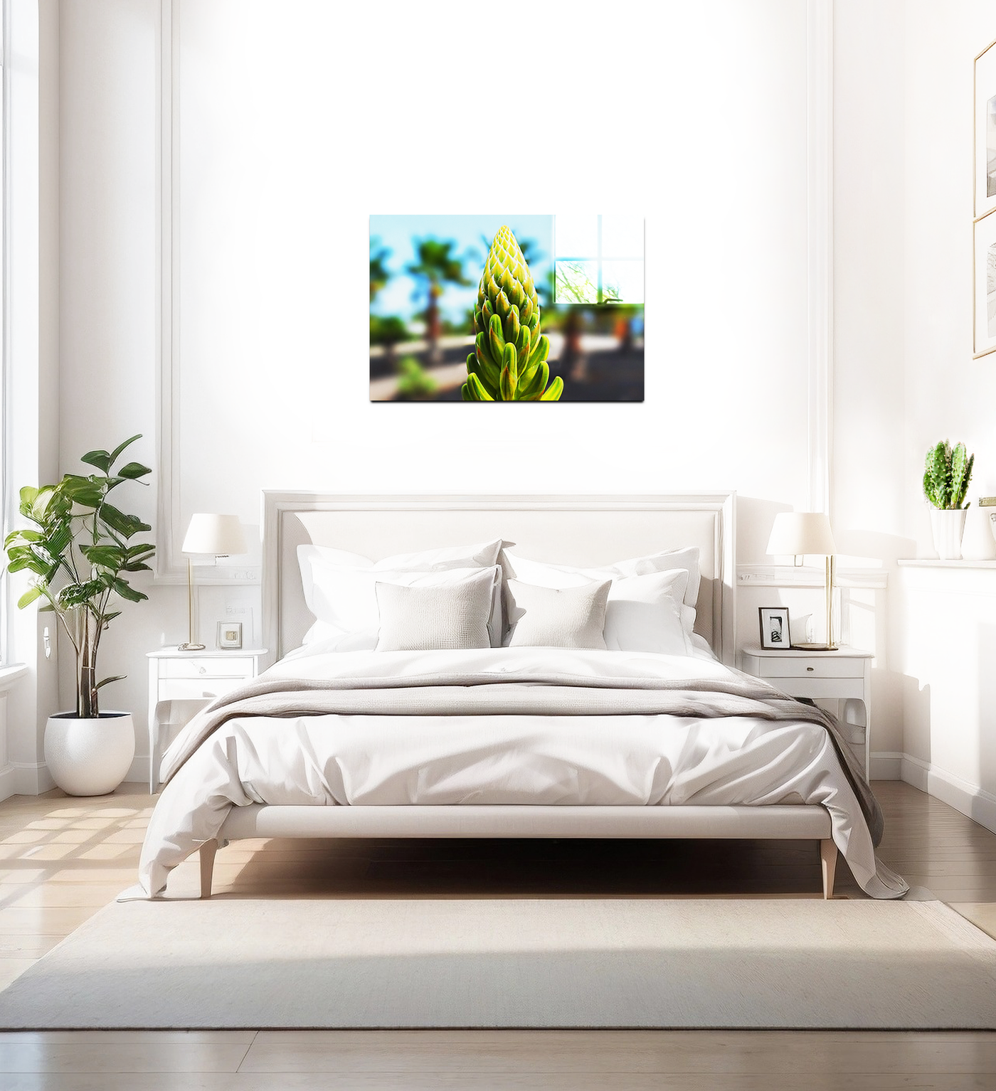 The colour scheme is a study in natural harmonies. The succulent itself presents a beautiful gradation of greens, from a soft, yellow-tinged hue at its apex to deeper, more saturated greens at its base. This is set against a background of gentle sky blues and hints of distant greenery, creating a sense of the plant's natural habitat. The 101 Canvas Prints photography team has excellently captured the play of light across the succulent's surface, revealing subtle variations in tone and texture that bring the image to life.