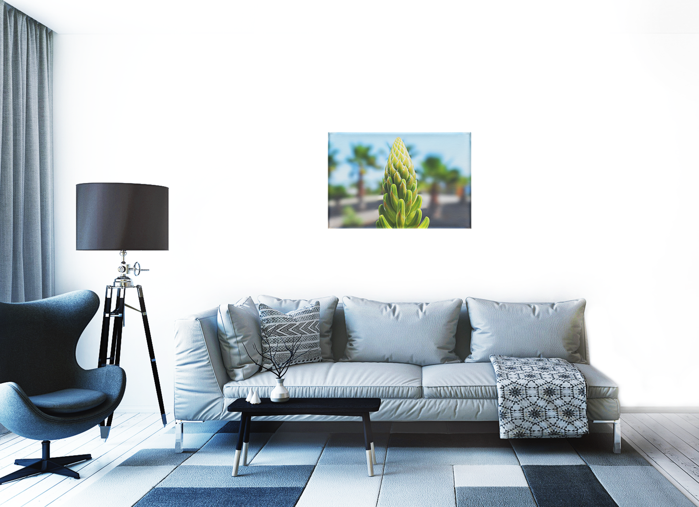 The colour palette is dominated by soothing, natural tones. The succulent itself displays a gradient of greens, from a pale, almost yellow-green at the tip, deepening to a rich emerald at the base. This verdant subject is set against a backdrop of soft blues and indistinct greens, suggestive of sky and distant foliage. The 101 Canvas Prints team has beautifully captured the interplay of light and shadow across the plant's surface, highlighting its unique texture and form.