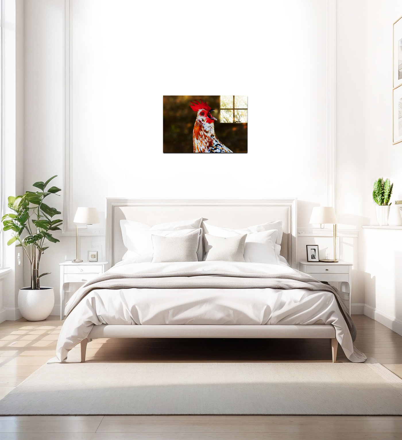 This Acrylic print of a brown and white hen is the perfect addition to your kitchen, dining room or breakfast nook. This hen comes alive in stunning detail with bright red plumage and subtle highlights across her face. Making for a unique gift for any poultry enthusiast, pet lover or animal print aficionado.