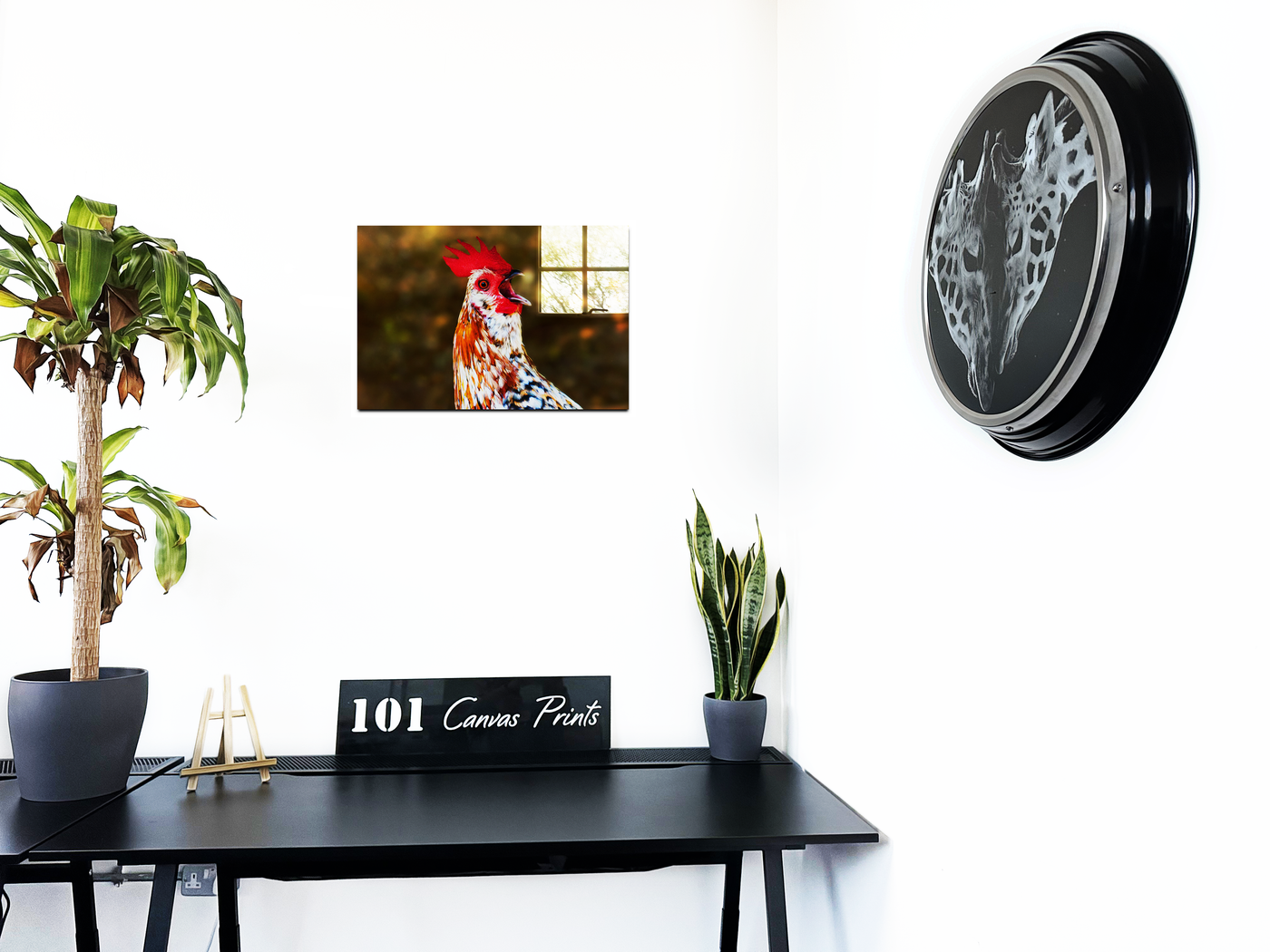 The key to any home is the striking artwork. This Acrylic print features a surprised hen, captured in a lifelike manner that's both beautiful and real.