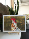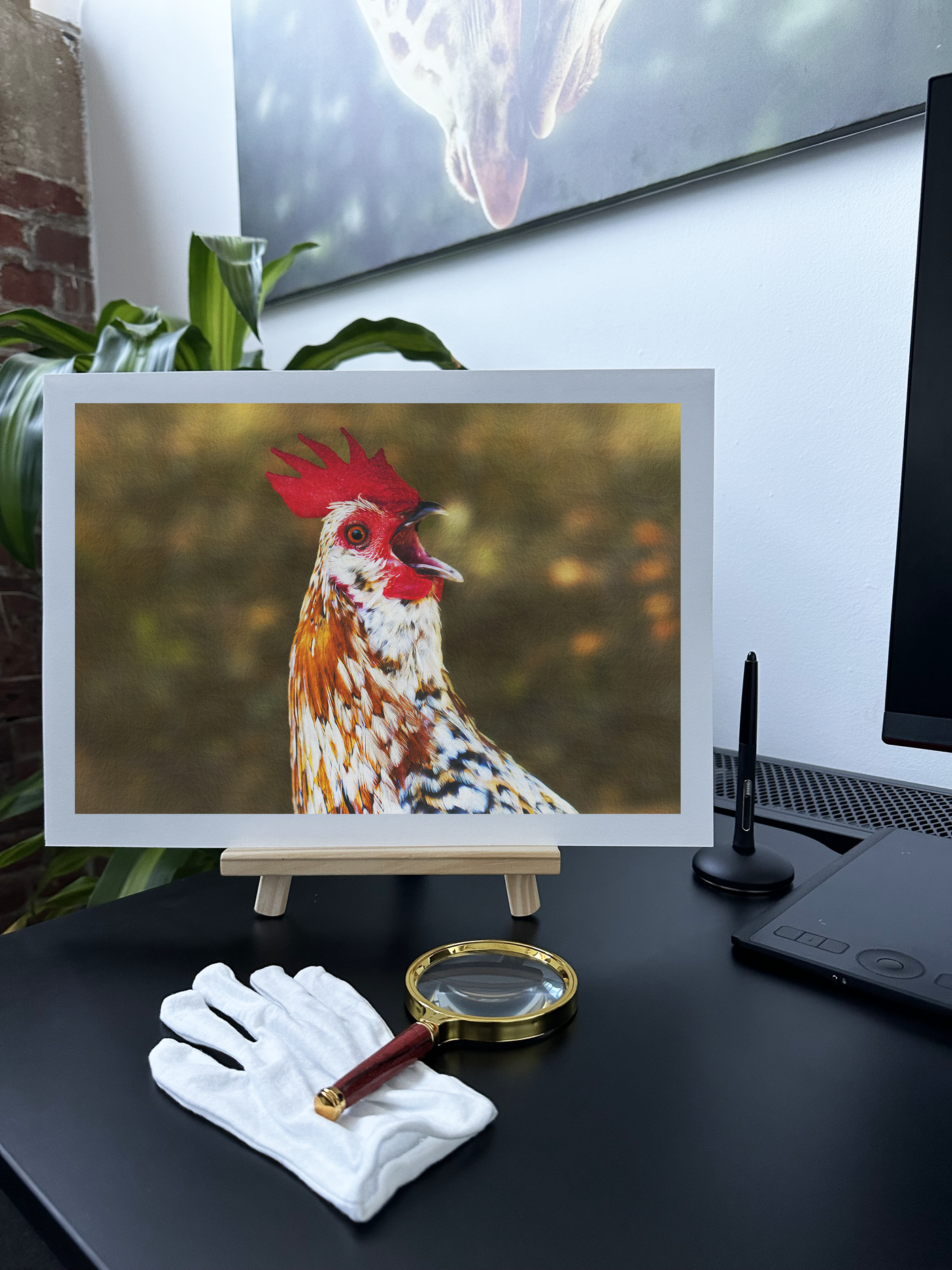 This Fine Art print of a brown and white hen is the perfect addition to your kitchen, dining room or breakfast nook. This hen comes alive in stunning detail with bright red plumage and subtle highlights across her face. Making for a unique gift for any poultry enthusiast, pet lover or animal print aficionado.
