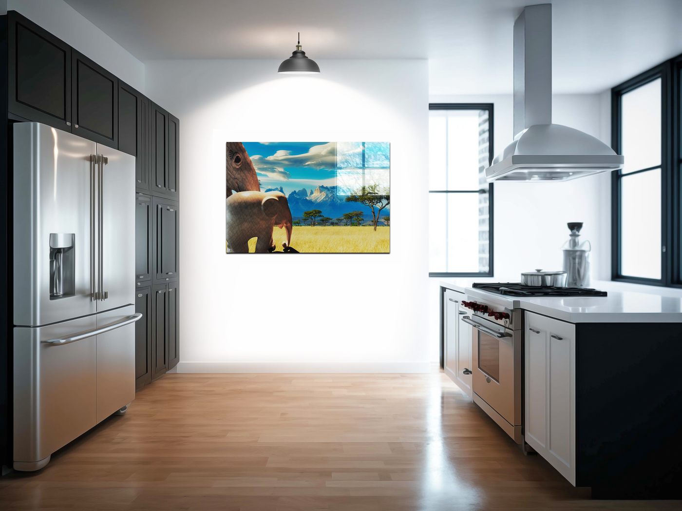 The Acrylic medium brings this scene to life with extraordinary vibrancy and clarity. The colour palette is rich and varied, from the warm, golden tones of the sunlit savanna to the cool, misty blues of the distant mountains. The elephant's hide is rendered in subtle shades of grey, its texture almost tangible, while the acacia trees provide a perfect counterpoint with their deep green foliage. The sky is a masterpiece of azure blue, dotted with clouds that seem to float effortlessly above the landscape.