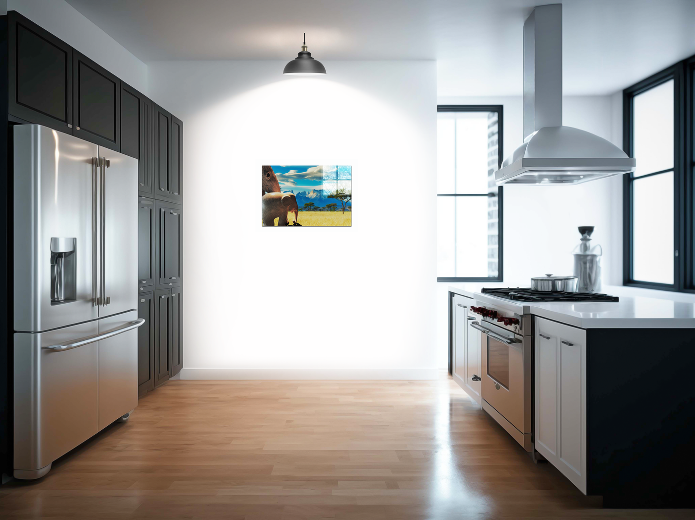 The Acrylic medium brings this scene to life with extraordinary vibrancy and clarity. The colour palette is rich and varied, from the warm, golden tones of the sunlit savanna to the cool, misty blues of the distant mountains. The elephant's hide is rendered in subtle shades of grey, its texture almost tangible, while the acacia trees provide a perfect counterpoint with their deep green foliage. The sky is a masterpiece of azure blue, dotted with clouds that seem to float effortlessly above the landscape.
