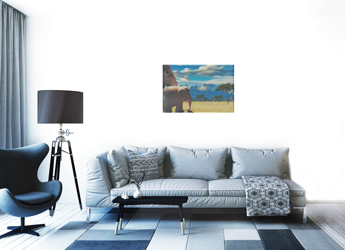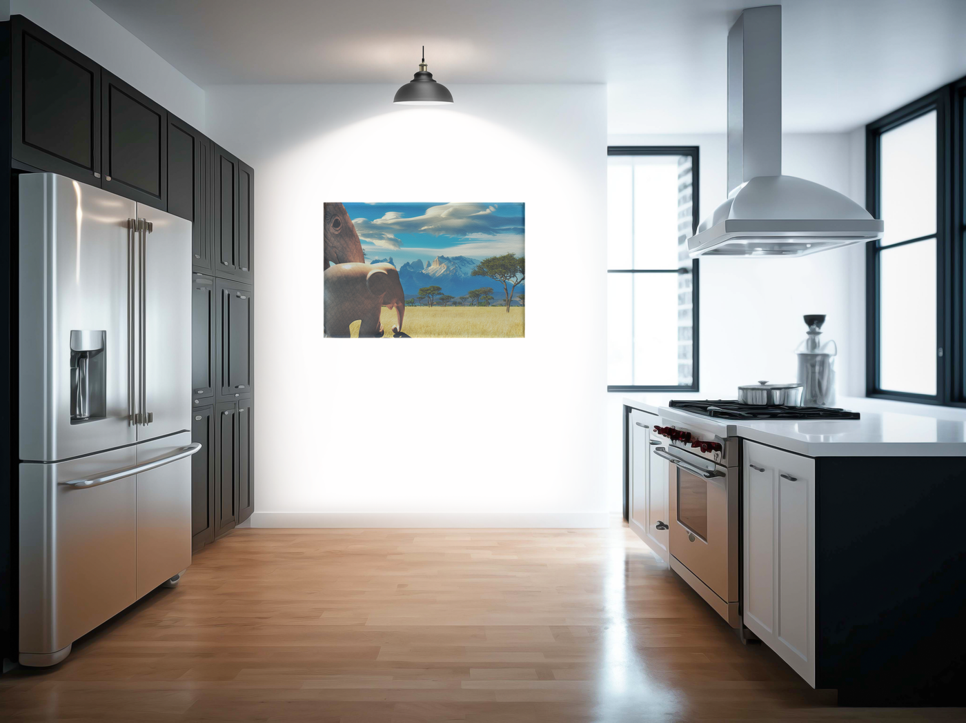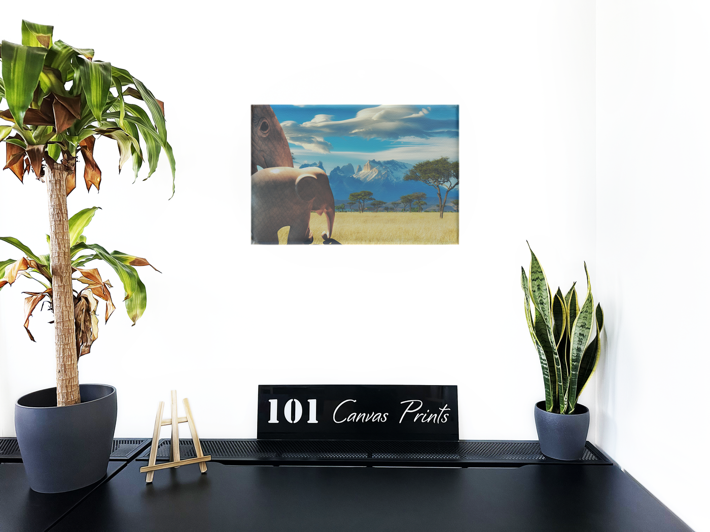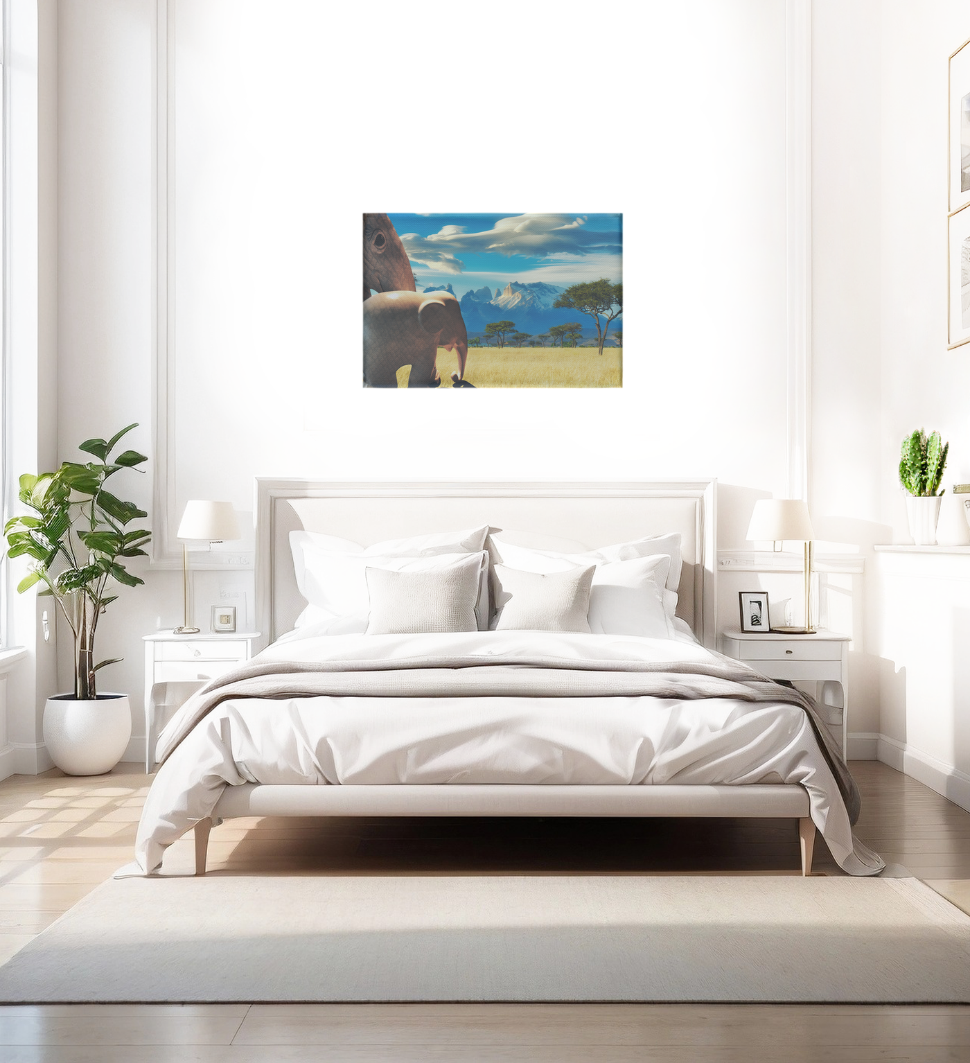 This captivating surrealism Canvas Art print transports viewers to the heart of the African savanna, showcasing a breathtaking scene where wildlife and landscape converge in perfect harmony. The composition is masterfully crafted, with a magnificent elephant dominating the foreground, its massive form partially visible as it stands sentinel over the expansive grasslands. The background unfolds into a classic African vista, with iconic acacia trees dotting the golden savanna and a dramatic mountain range rising majestically on the horizon.