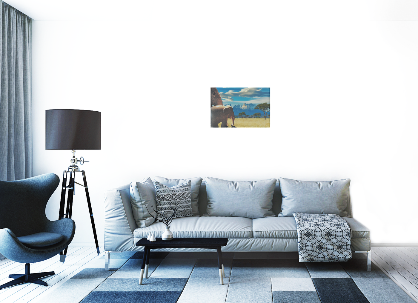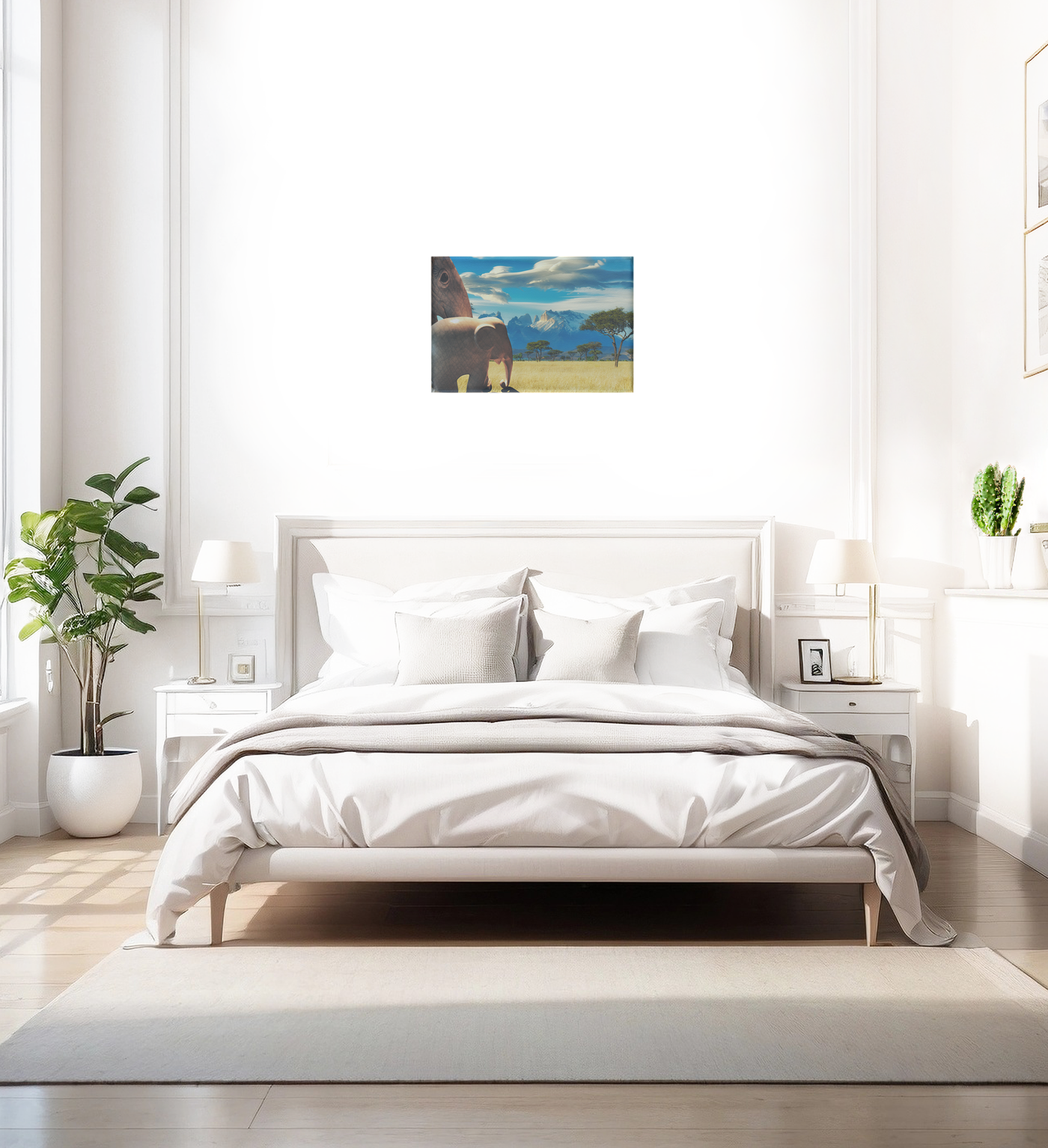 This captivating surrealism Canvas Art print transports viewers to the heart of the African savanna, showcasing a breathtaking scene where wildlife and landscape converge in perfect harmony. The composition is masterfully crafted, with a magnificent elephant dominating the foreground, its massive form partially visible as it stands sentinel over the expansive grasslands. The background unfolds into a classic African vista, with iconic acacia trees dotting the golden savanna and a dramatic mountain range rising majestically on the horizon.