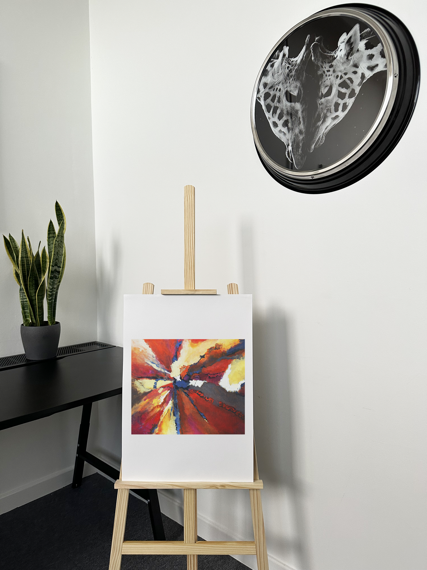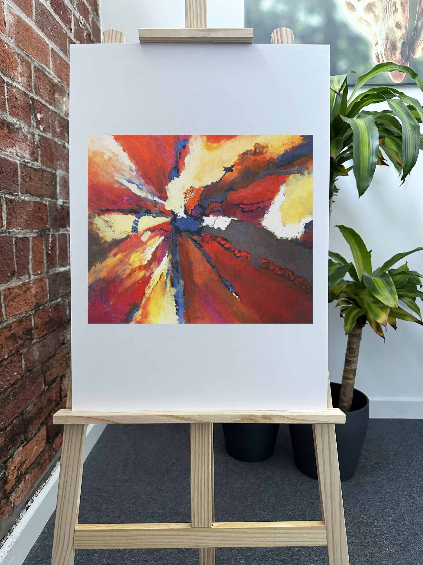 Presented on our premium Fine Art paper, this piece takes on an additional layer of tactile appeal. The natural, matte finish of the Fine Art print medium perfectly complements the painting's organic energy, allowing the textures of the original artwork to shine through. This Fine Art print maintains the raw emotional power of the piece while softening the intense colours just enough to make it suitable for contemplative spaces. Perfect for a feature wall in a modern home, corporate boardroom, or meditation space, this artwork invites viewers to reflect on the journey of life on Earth and our place within the cosmic narrative.