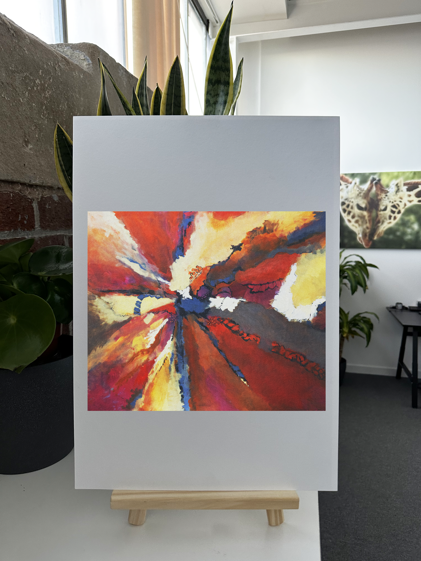 Presented on our premium Fine Art paper, this piece takes on an additional layer of tactile appeal. The natural, matte finish of the Fine Art print medium perfectly complements the painting's organic energy, allowing the textures of the original artwork to shine through. This Fine Art print maintains the raw emotional power of the piece while softening the intense colours just enough to make it suitable for contemplative spaces. Perfect for a feature wall in a modern home, corporate boardroom, or meditation space, this artwork invites viewers to reflect on the journey of life on Earth and our place within the cosmic narrative.