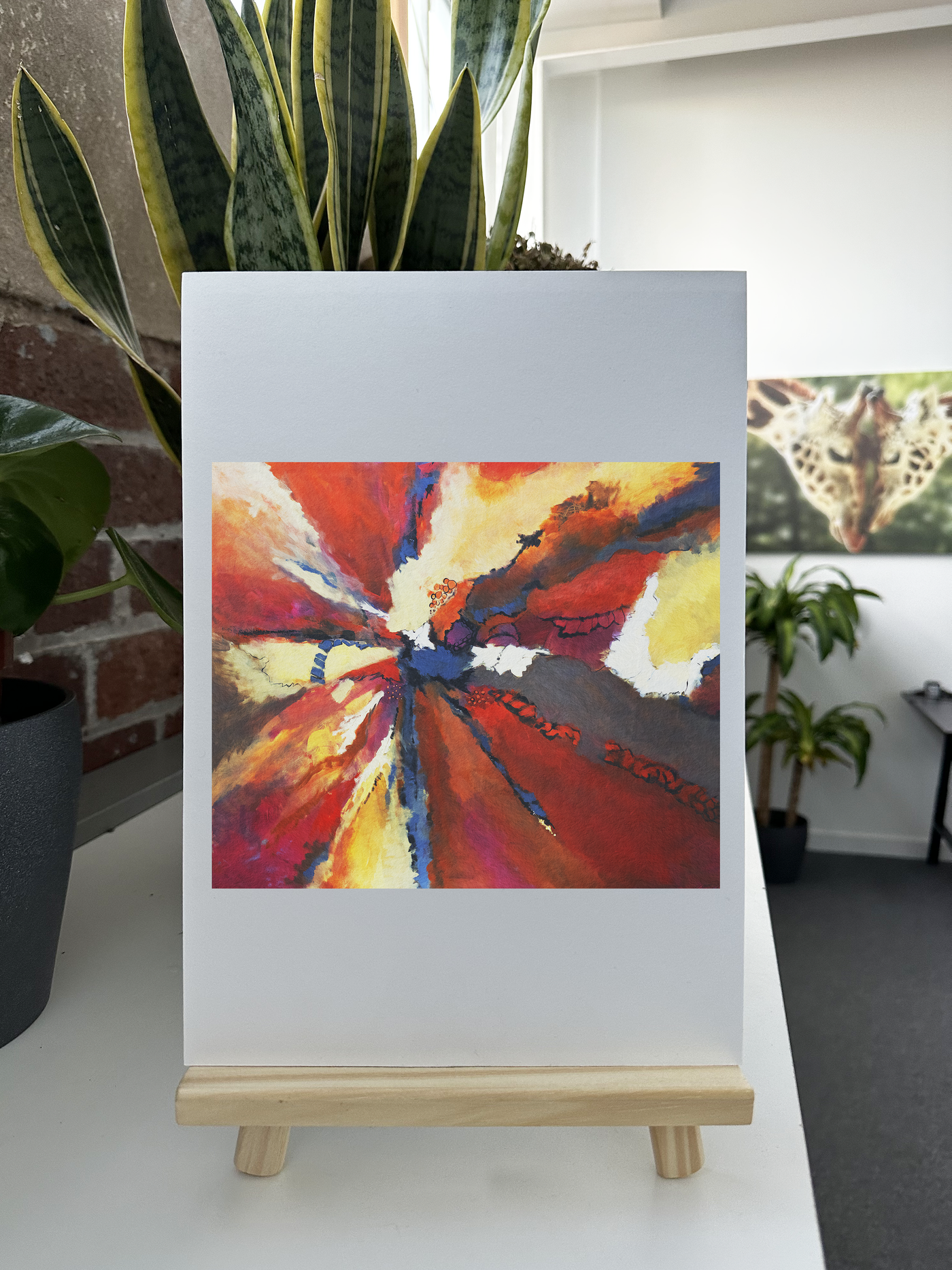 Presented on our premium Fine Art paper, this piece takes on an additional layer of tactile appeal. The natural, matte finish of the Fine Art print medium perfectly complements the painting's organic energy, allowing the textures of the original artwork to shine through. This Fine Art print maintains the raw emotional power of the piece while softening the intense colours just enough to make it suitable for contemplative spaces. Perfect for a feature wall in a modern home, corporate boardroom, or meditation space, this artwork invites viewers to reflect on the journey of life on Earth and our place within the cosmic narrative.