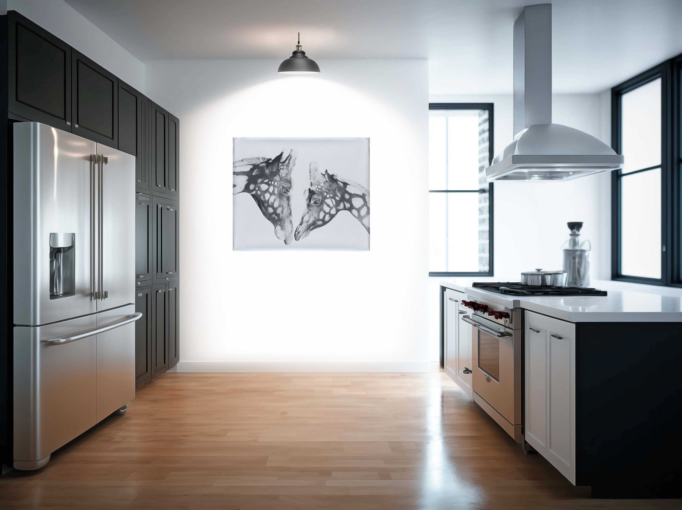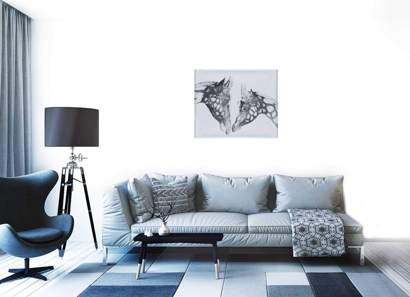 The Giraffes Kiss Canvas print is a beautiful interpretation of the love between Soul Mate partners. The female giraffe has her head nestled into the male giraffe's head, appearing to be kissing him on the cheek.