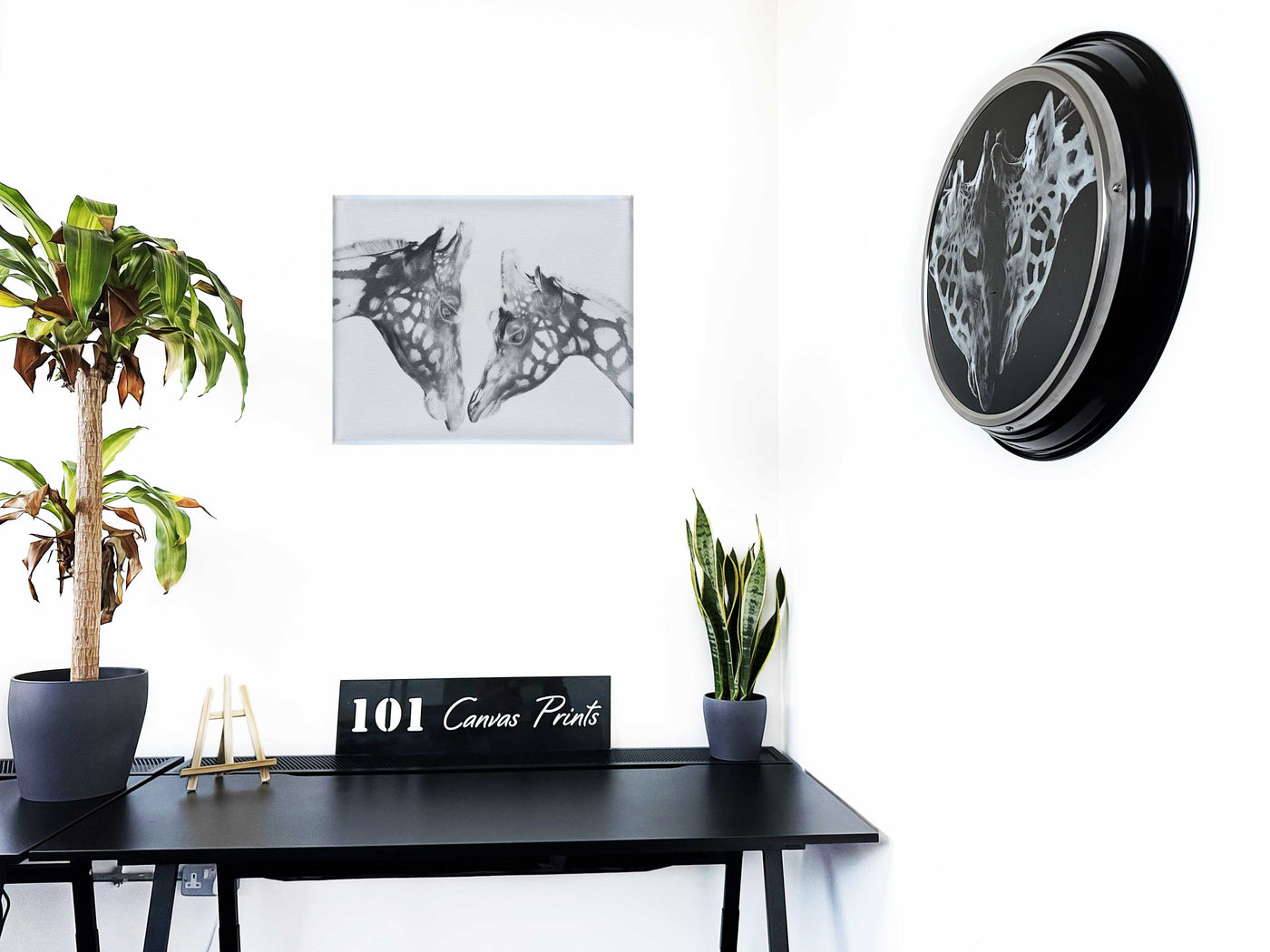 Add a lovely piece of summer décor to any room with this incredible Canvas print. Framed and mounted, the Giraffes Kiss Canvas Print is an ideal gift for any animal lover. The striking image offers a new perspective of the unique relationship between Soul Mate partners. Handprinted in the UK, this beautiful image would look fantastic on any wall.