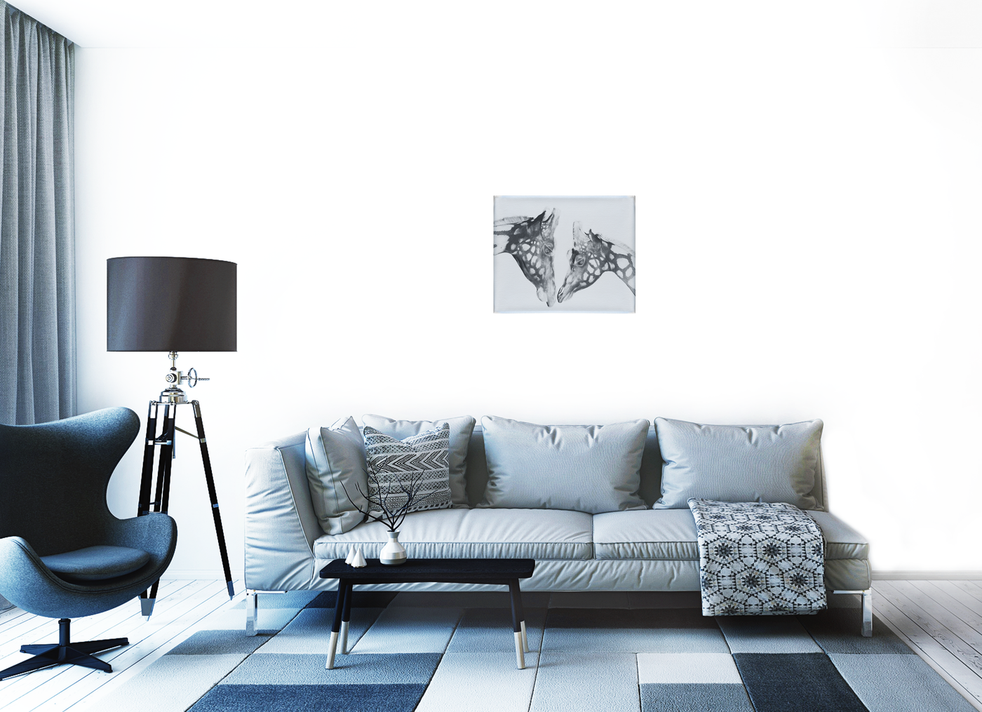 The Giraffes Kiss Canvas print is a beautiful interpretation of the love between Soul Mate partners. The female giraffe has her head nestled into the male giraffe's head, appearing to be kissing him on the cheek.