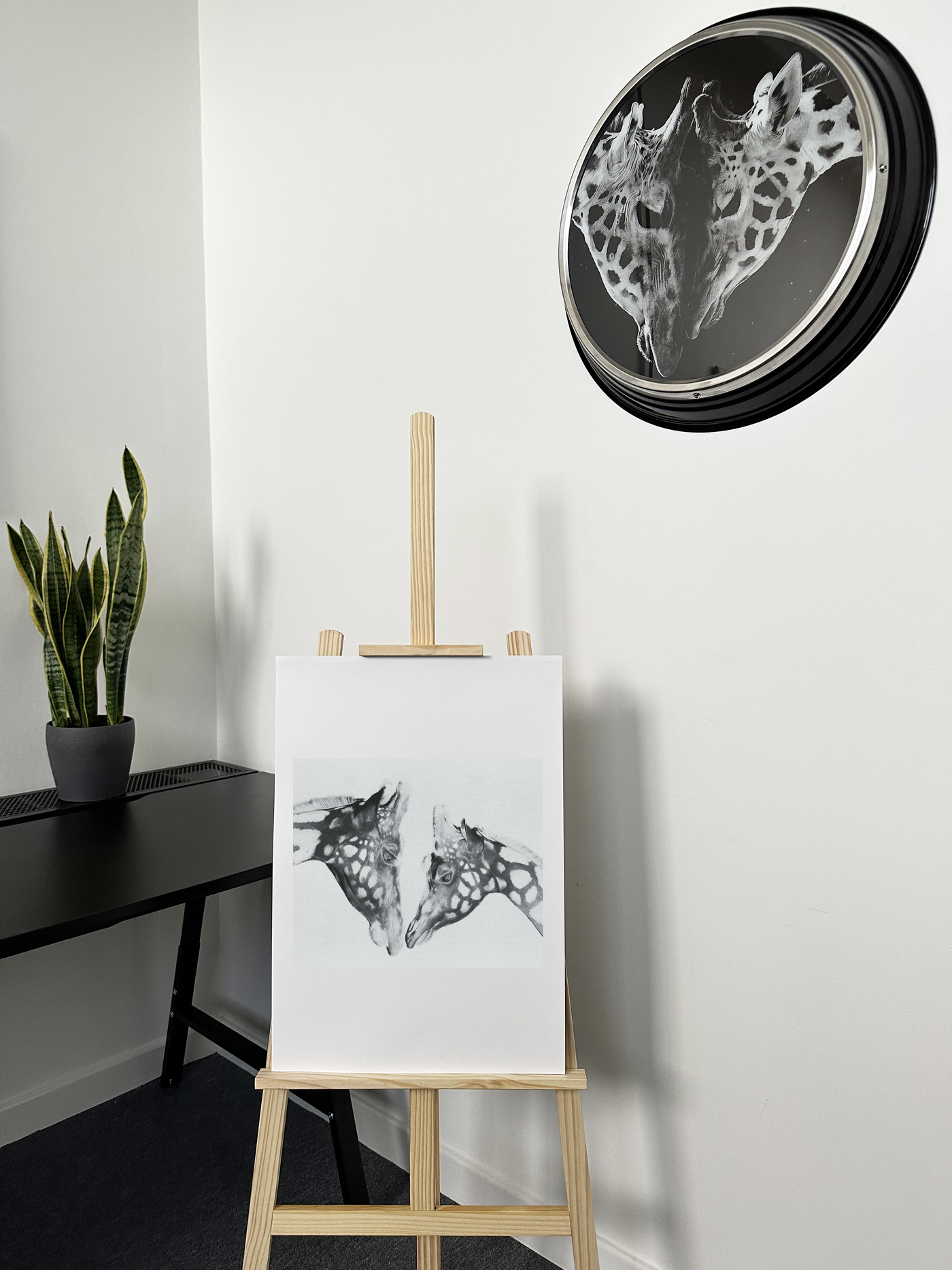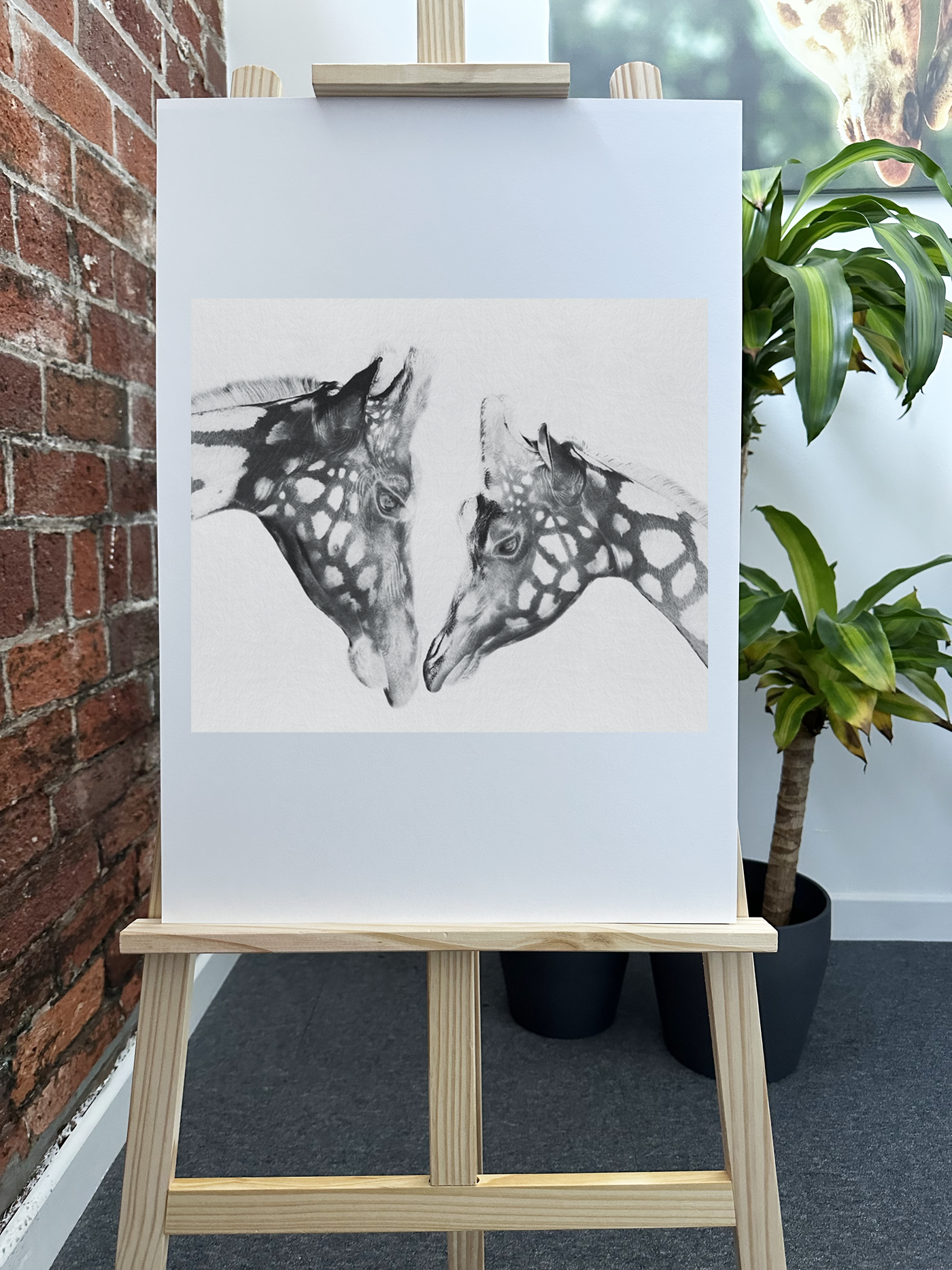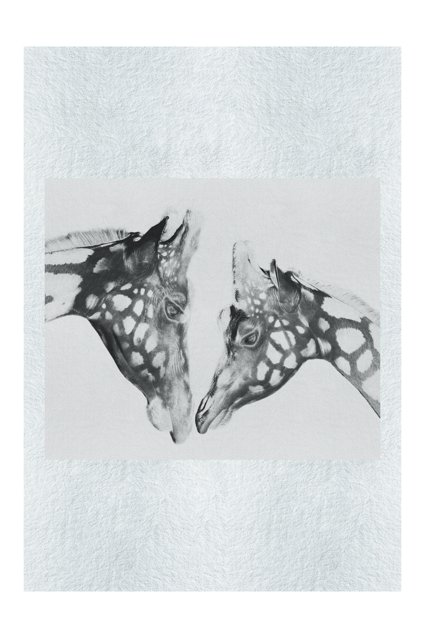 The Giraffes Kiss Monochrome Fine Art print is a beautiful interpretation of the love between Soul Mate partners. The female giraffe has her head nestled into the male giraffe's head, appearing to be kissing him on the cheek.