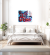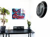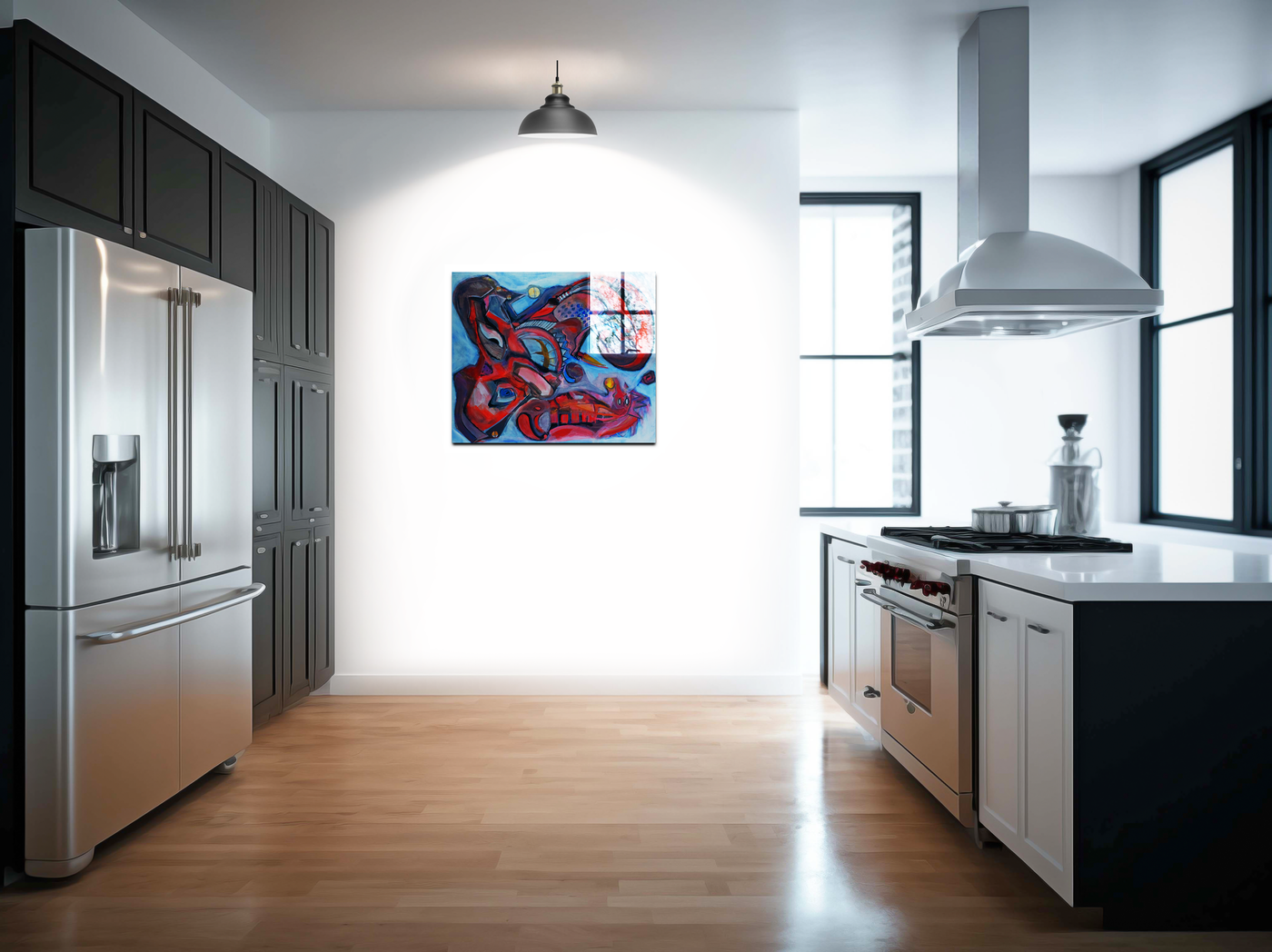 The artist's choice of colours brings this allegorical tale to vivid life, with passionate reds and royal purples dominating the composition. Geometric patterns and diamond shapes, characteristic of the Harlequin's costume, dance across the Acrylic print, while darker, more sinuous forms suggest the dragon's defeat. Through our precise photography and print enhancement process, we've maintained every subtle detail that contributes to this story of triumph, from the smallest pattern to the boldest gesture.