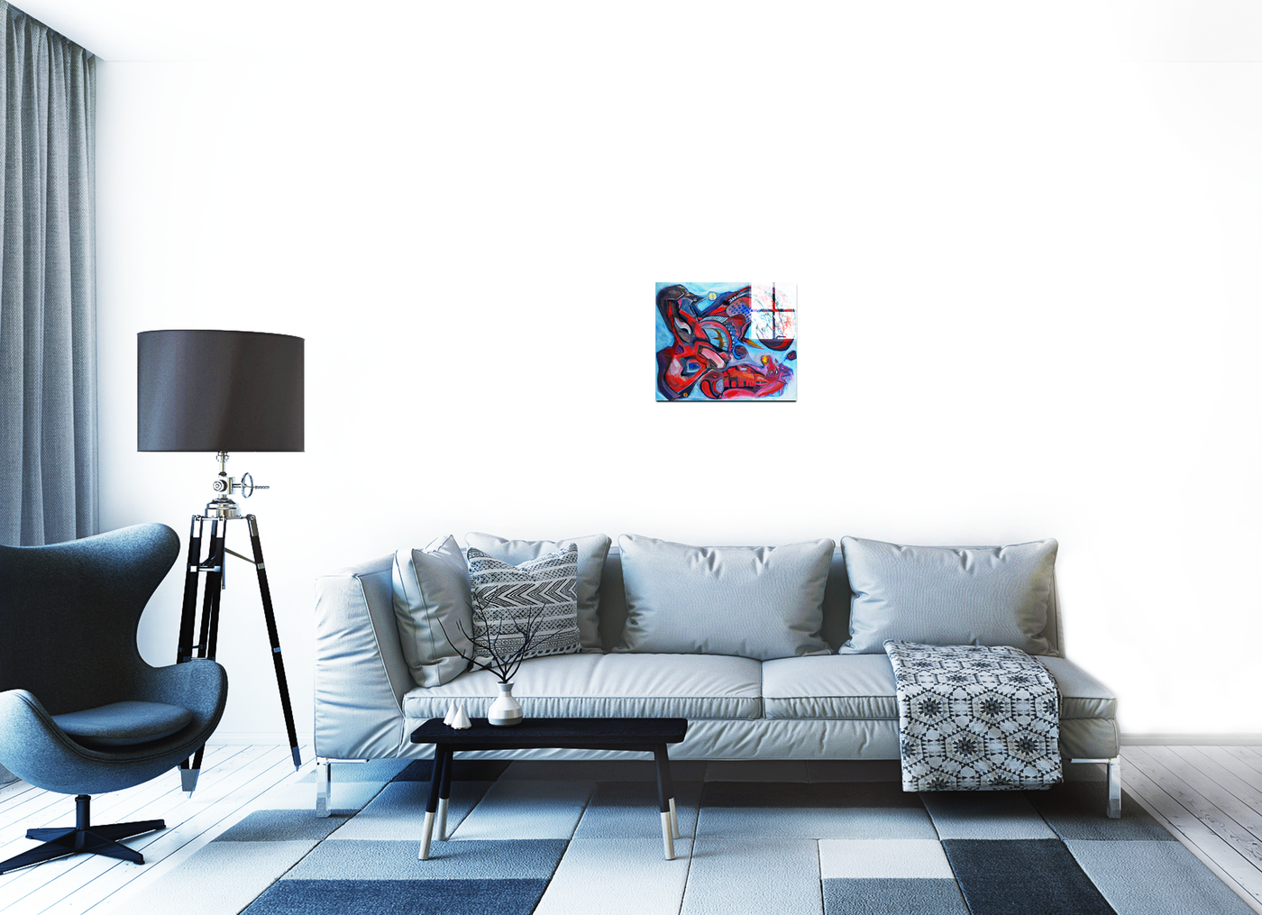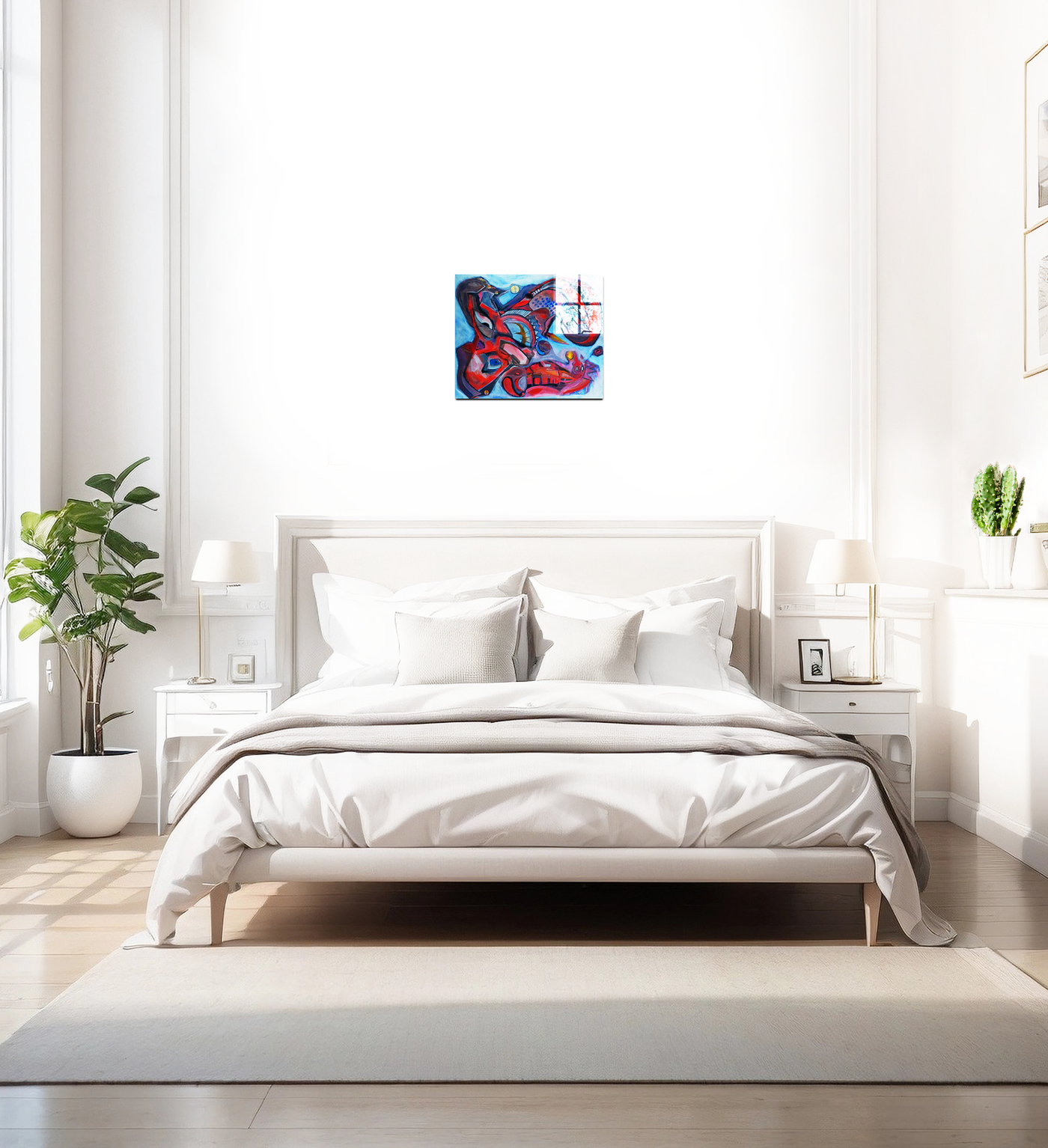 The artist's choice of colours brings this allegorical tale to vivid life, with passionate reds and royal purples dominating the composition. Geometric patterns and diamond shapes, characteristic of the Harlequin's costume, dance across the Acrylic print, while darker, more sinuous forms suggest the dragon's defeat. Through our precise photography and print enhancement process, we've maintained every subtle detail that contributes to this story of triumph, from the smallest pattern to the boldest gesture.