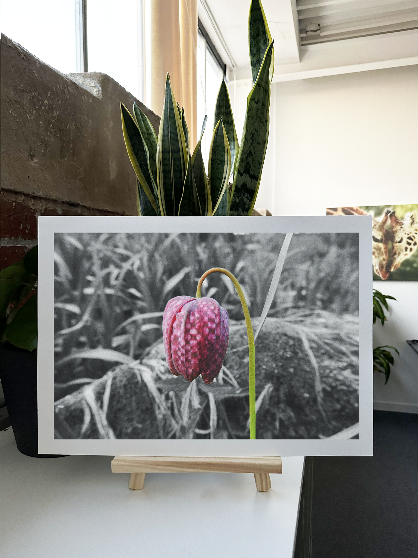 The colour palette employs a sophisticated selective colouring technique, maintaining the natural pink and purple checkerboard pattern of the fritillary's petals and its fresh green stem while rendering the surrounding foliage in subtle greyscale. Our print enhancement team have carefully preserved every detail of the flower's unique pattern and texture while ensuring the monochromatic background provides the perfect amount of context without overwhelming the main subject.