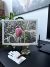 Reproduced on our premium Fine Art paper material, this botanical portrait takes on an additional layer of artistic refinement. The natural, matte finish of the Fine Art print softens the contrast between the coloured flower and grey background, creating a dreamy, painterly quality that enhances the image's poetic nature. This piece would make a striking addition to any space where its quiet beauty and artistic treatment can be appreciated, from a contemporary home to a professional office seeking a touch of subtle sophistication.