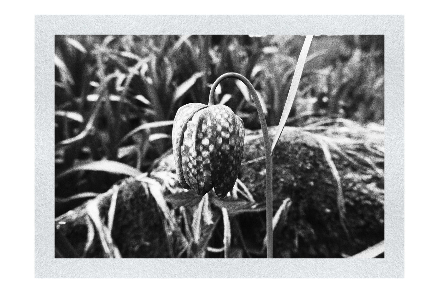 The Monochrome palette employs a sophisticated selective tonal technique, maintaining the natural silvery checkerboard pattern of the fritillary's petals and its fresh light stem while rendering the surrounding foliage in subtle greyscale. Our print enhancement team have carefully preserved every detail of the flower's unique pattern and texture while ensuring the monochromatic background provides the perfect amount of context without overwhelming the main subject.