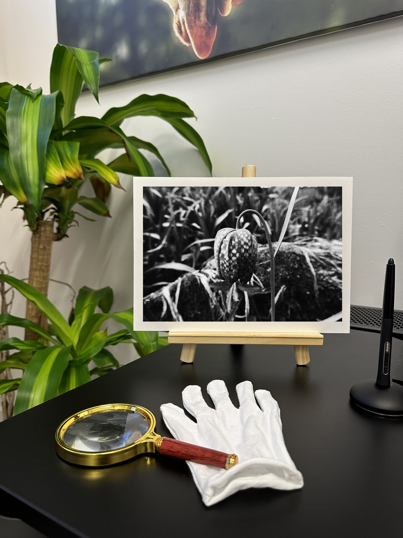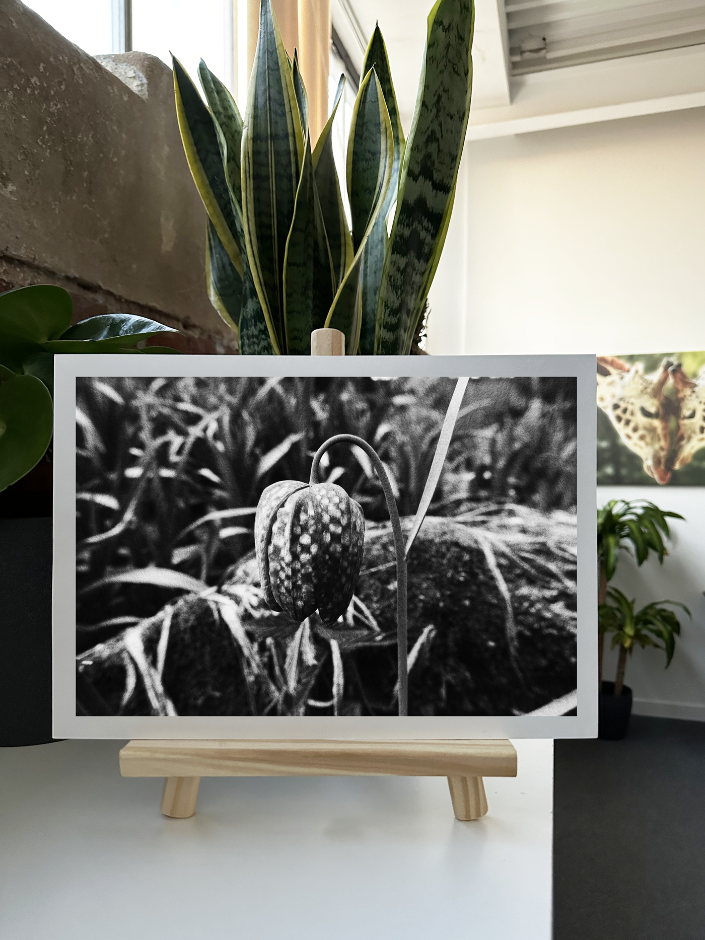 The Monochrome palette employs a sophisticated selective tonal technique, maintaining the natural silvery checkerboard pattern of the fritillary's petals and its fresh light stem while rendering the surrounding foliage in subtle greyscale. Our print enhancement team have carefully preserved every detail of the flower's unique pattern and texture while ensuring the monochromatic background provides the perfect amount of context without overwhelming the main subject.