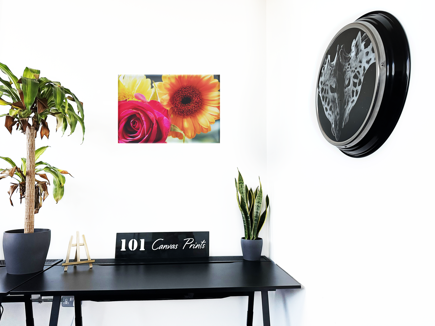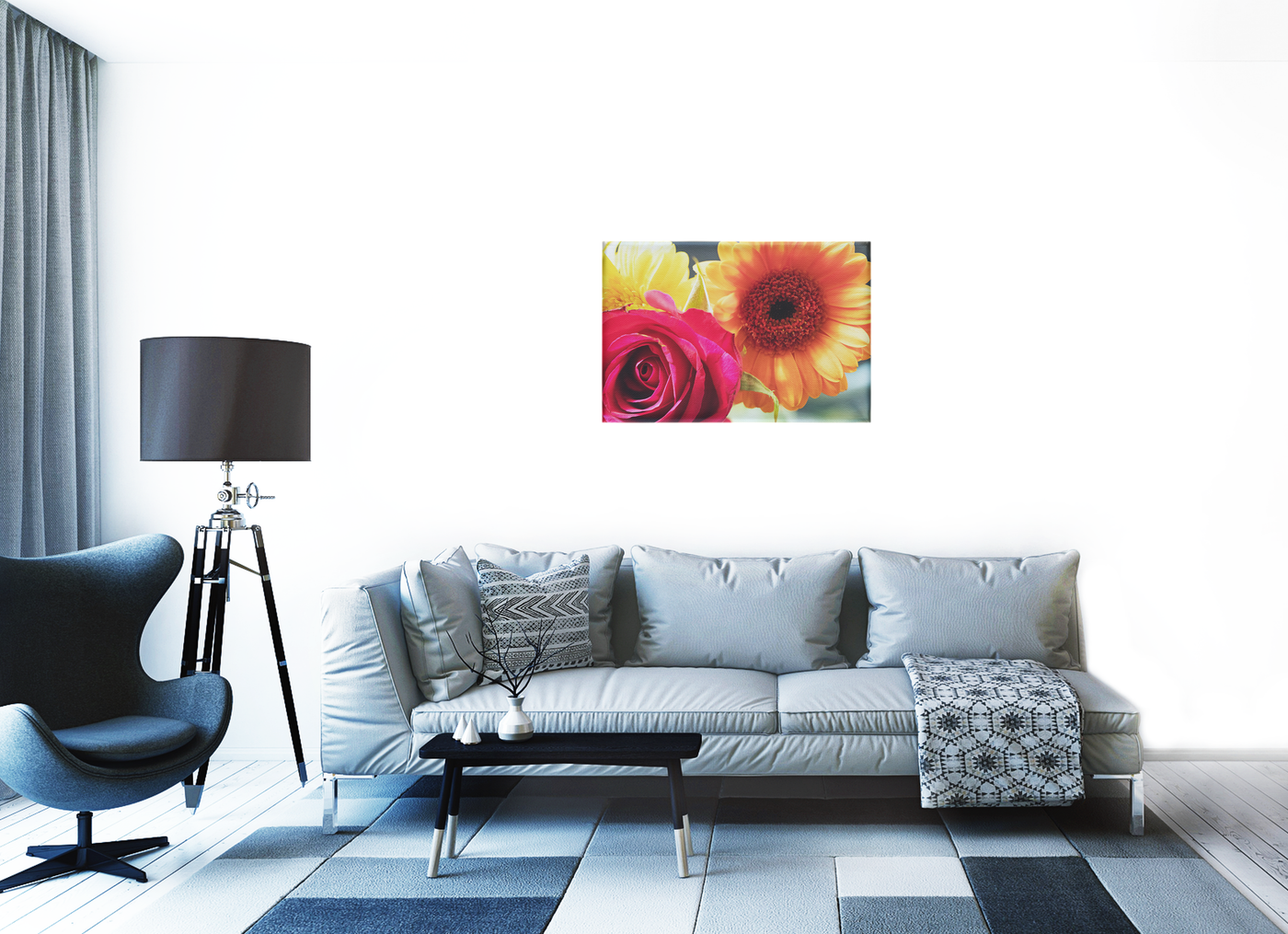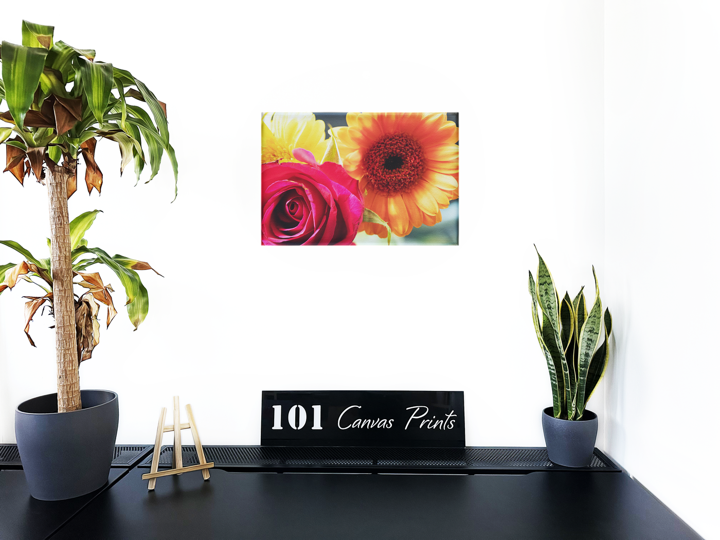 This captivating Canvas print showcases a stunning close-up of two exquisite flowers: a vivid pink rose and radiant orange & yellow gerbera daisies. The composition is masterfully arranged, with the rose dominating the left foreground and the gerbera taking centre stage on the right. A hint of yellow petals in the background adds depth and intrigue to the scene.