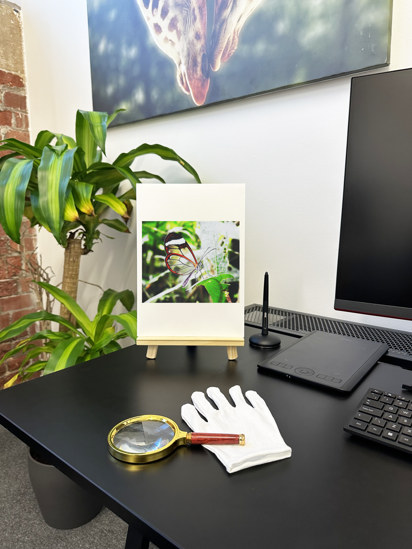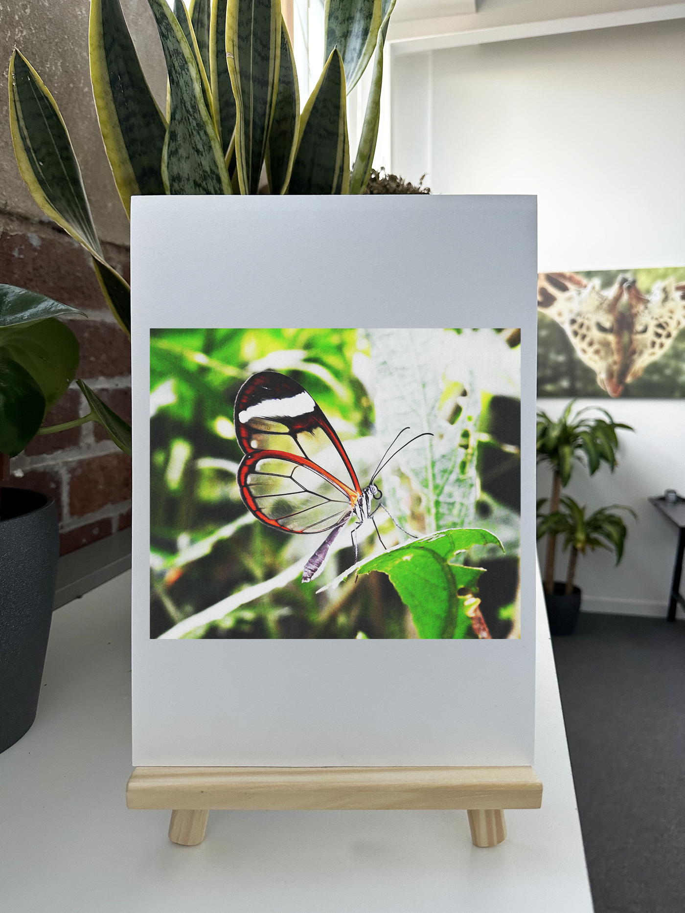 The natural texture of the Fine Art paper adds a subtle depth to the image, softening the contrast between the butterfly's transparent wings and the vibrant green foliage. This interplay creates a harmonious balance, emphasising the butterfly's delicate structure while grounding it in its natural habitat. The matte finish of the Fine Art print reduces glare, allowing viewers to appreciate the intricate details of the butterfly from any angle.