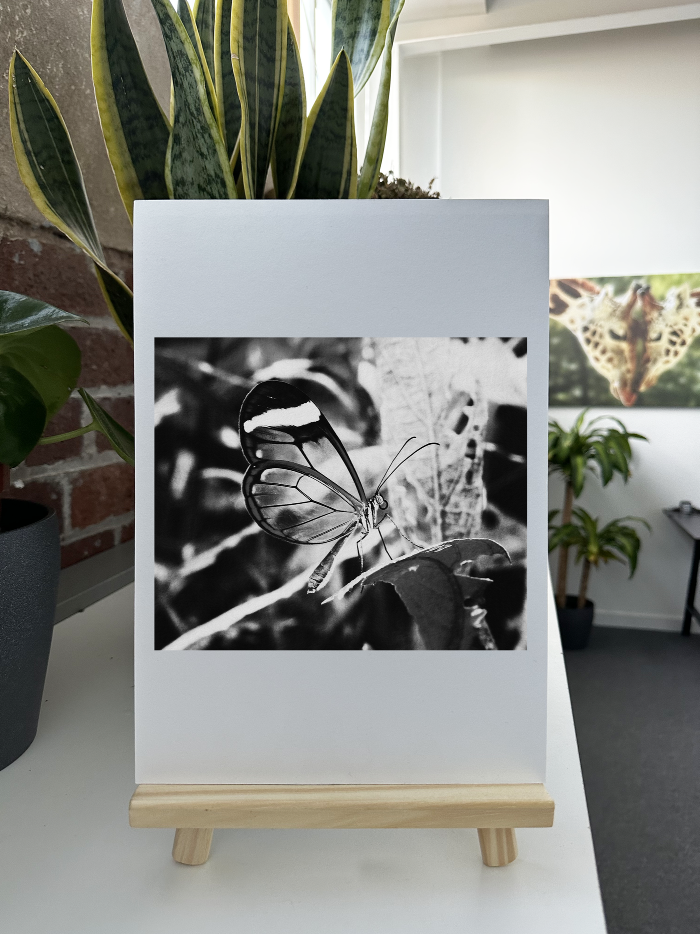 The natural texture of the Fine Art paper adds a subtle depth to the image, softening the contrast between the butterfly's transparent wings and the vibrant silvery foliage. This interplay creates a harmonious balance, emphasising the butterfly's delicate structure while grounding it in its natural habitat. The matte finish of the Fine Art print reduces glare, allowing viewers to appreciate the intricate details of the butterfly from any angle.