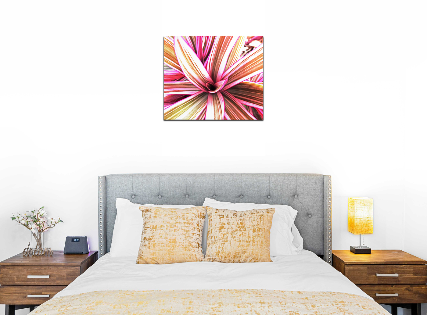 The colour palette is a celebration of warm, inviting hues, dominated by soft pinks and beiges with delicate green undertones. The Acrylic medium amplifies these colours, bringing them to life with enhanced intensity and depth. The glossy finish of the Acrylic creates a luminous effect, mimicking the way sunlight might dance across the surface of the leaves in their natural habitat. This treatment also accentuates the subtle textures and patterns within the foliage, from the fine striations to the gentle curves of each leaf.