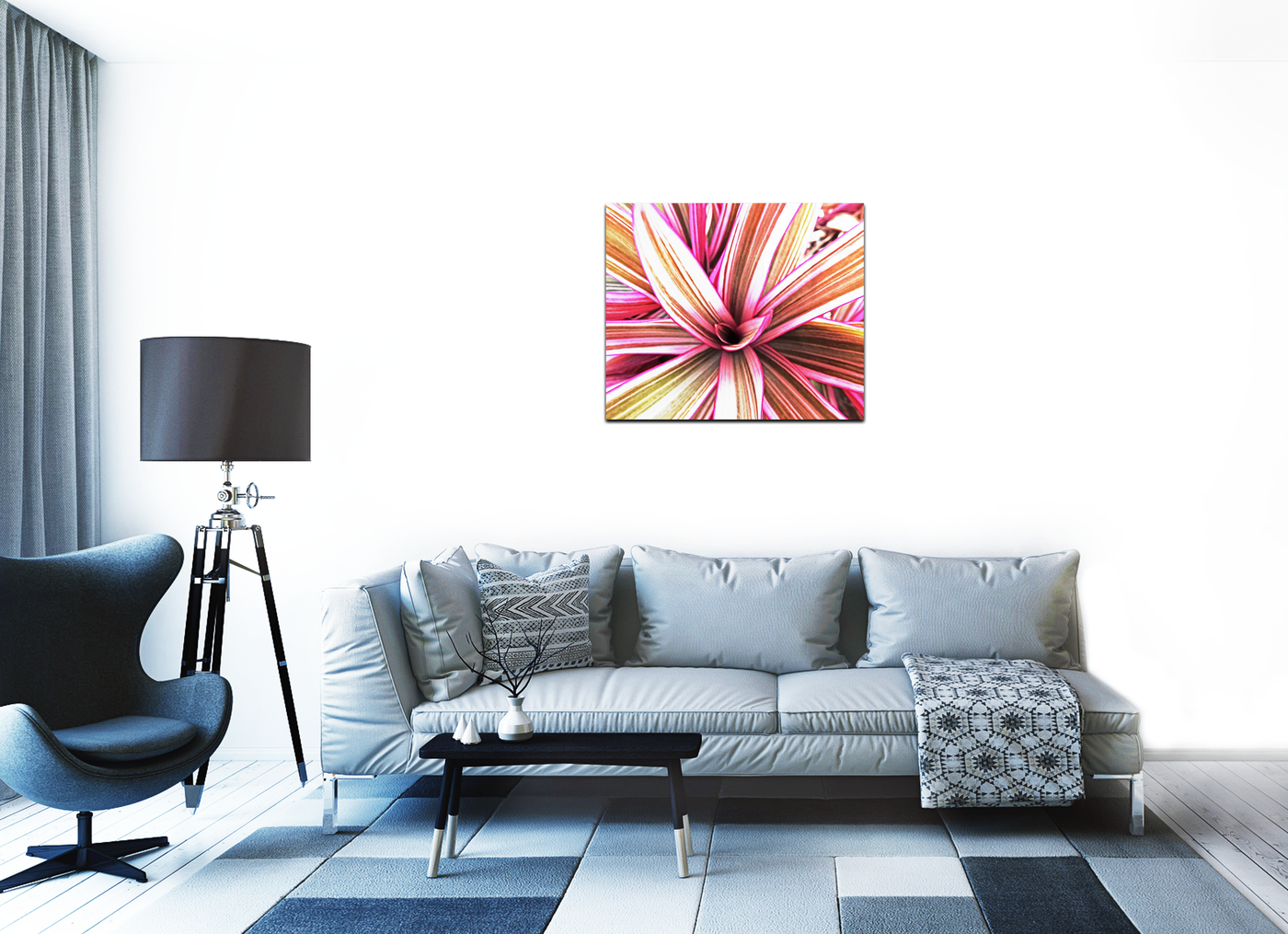 This breathtaking acrylic-set print captures the vibrant essence of a tropical bromeliad plant in stunning detail. The composition focuses on the plant's centre, with its leaves unfurling outwards in a spectacular display of nature's artistry. The image draws the viewer in, encouraging a closer look at the intricate patterns and subtle colour variations within each leaf.