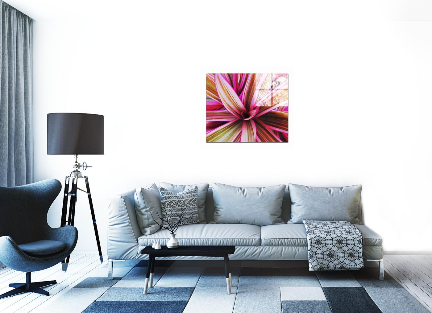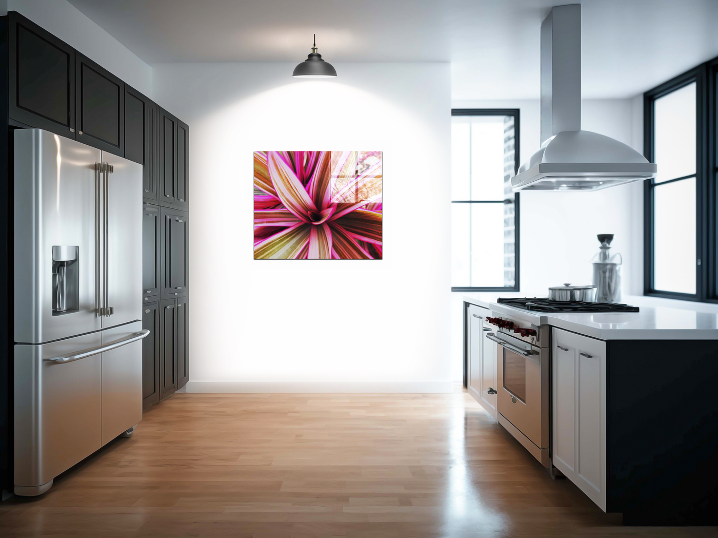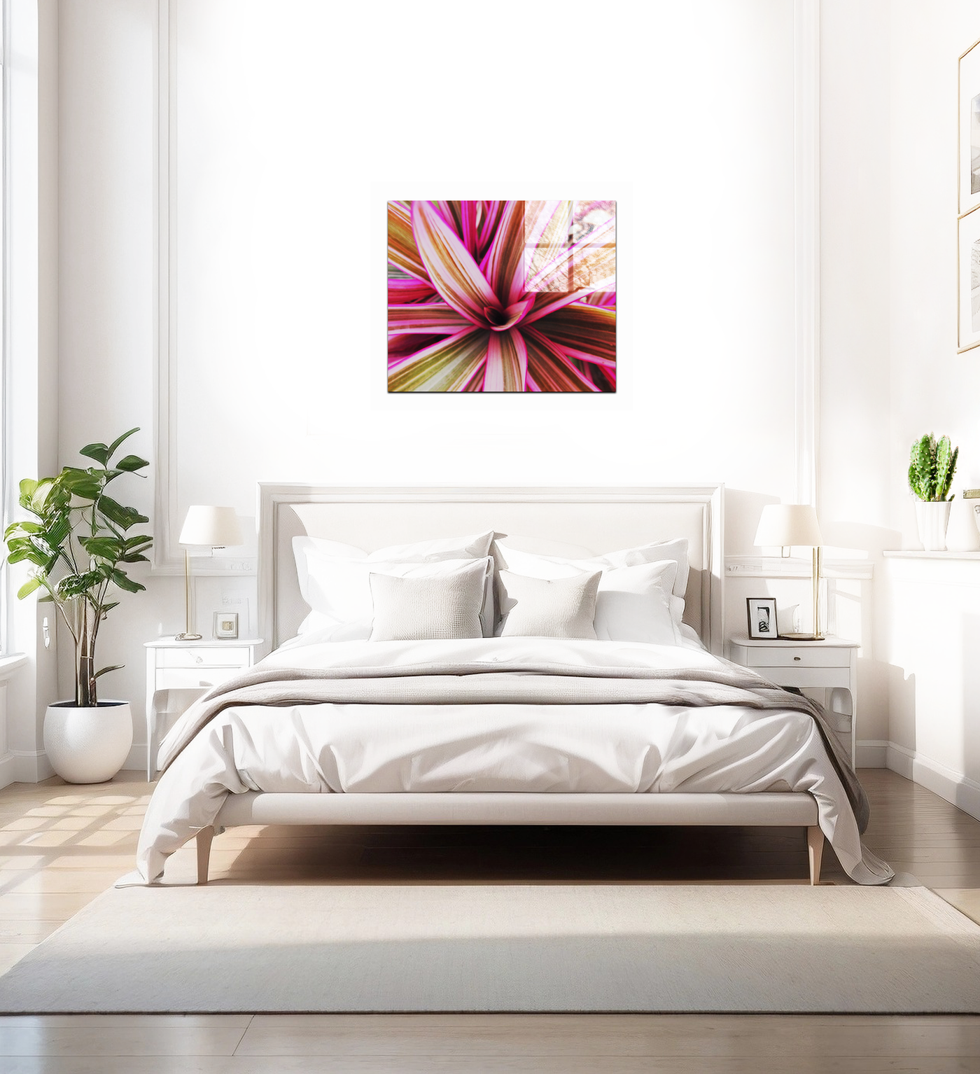 This breathtaking acrylic-set print captures the vibrant essence of a tropical bromeliad plant in stunning detail. The composition focuses on the plant's centre, with its leaves unfurling outwards in a spectacular display of nature's artistry. The image draws the viewer in, encouraging a closer look at the intricate patterns and subtle colour variations within each leaf.