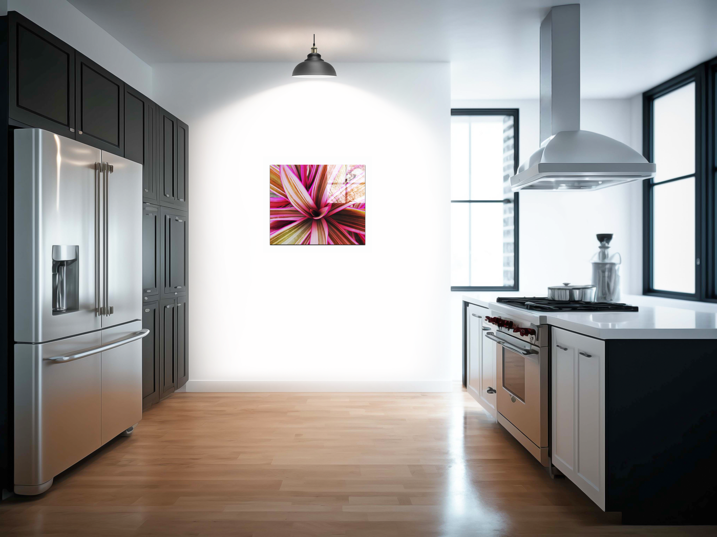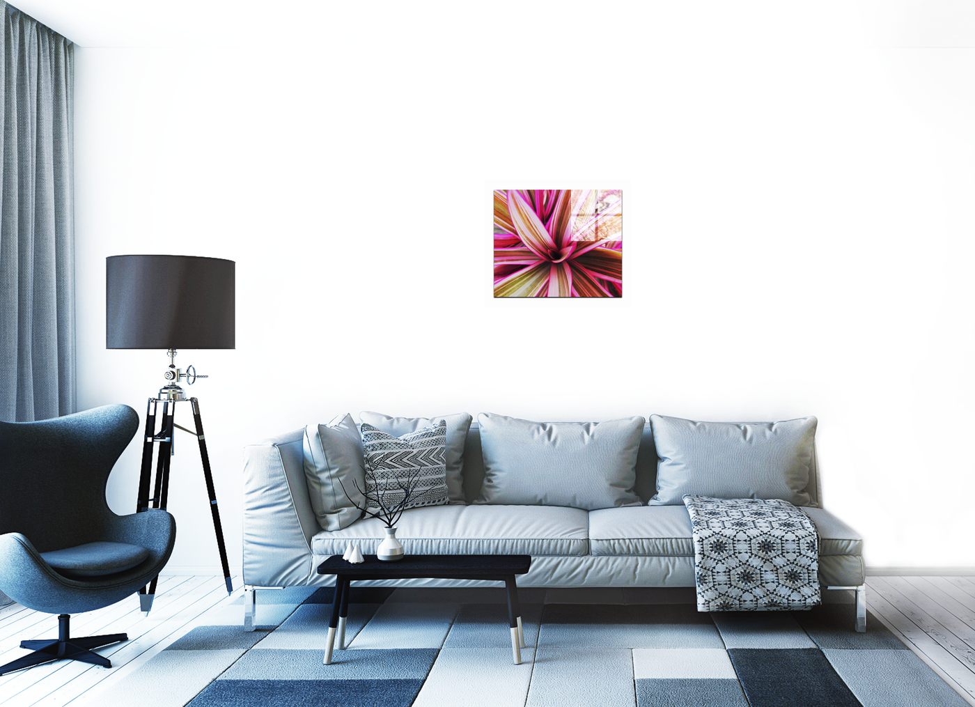 This breathtaking acrylic-set print captures the vibrant essence of a tropical bromeliad plant in stunning detail. The composition focuses on the plant's centre, with its leaves unfurling outwards in a spectacular display of nature's artistry. The image draws the viewer in, encouraging a closer look at the intricate patterns and subtle colour variations within each leaf.