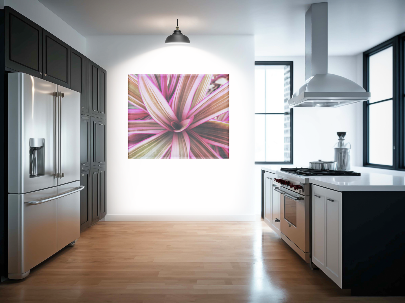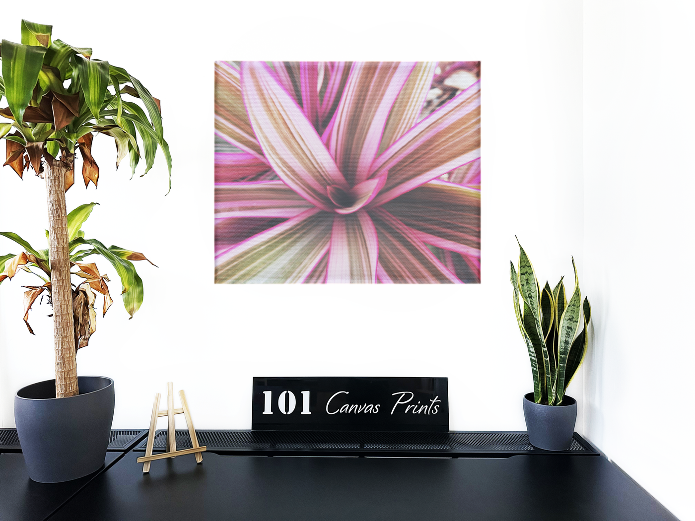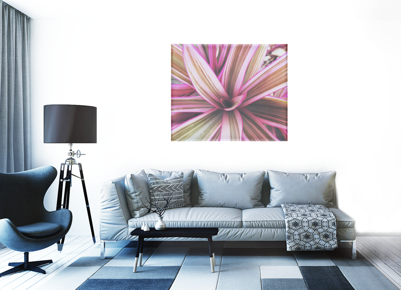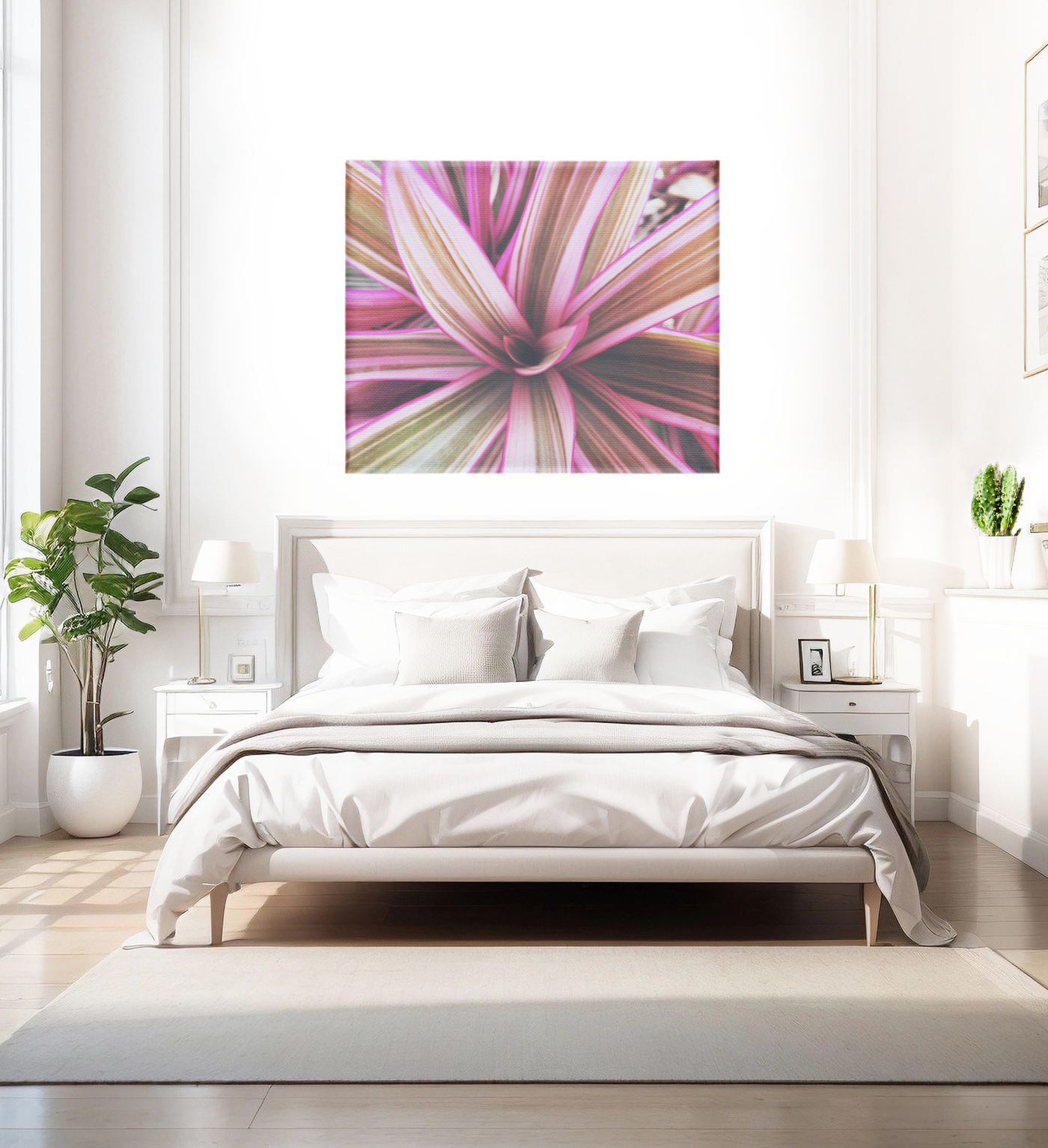 This captivating Canvas print showcases the intricate beauty of a tropical bromeliad plant, its leaves bursting forth in a mesmerising array of colours. The composition draws the viewer's eye to the centre of the plant, where delicate pink and beige leaves radiate outwards in a stunning display of natural geometry.