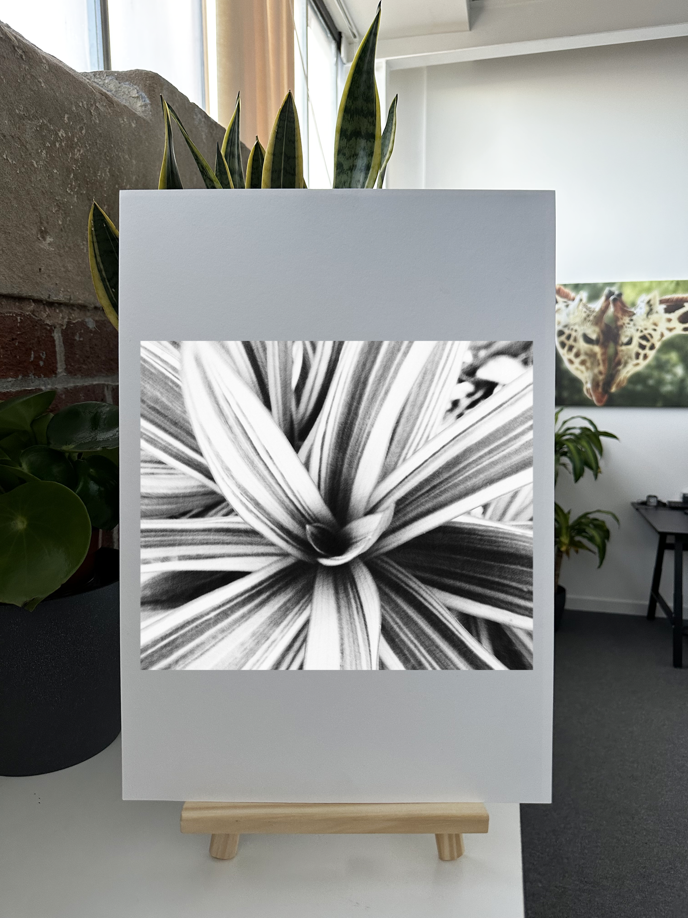 This captivating Monochrome Fine Art print showcases the intricate beauty of a tropical bromeliad plant, its leaves bursting forth in a mesmerising array of Monochromatic tones. The composition draws the viewer's eye to the centre of the plant, where delicate silvery leaves radiate outwards in a stunning display of natural geometry.
