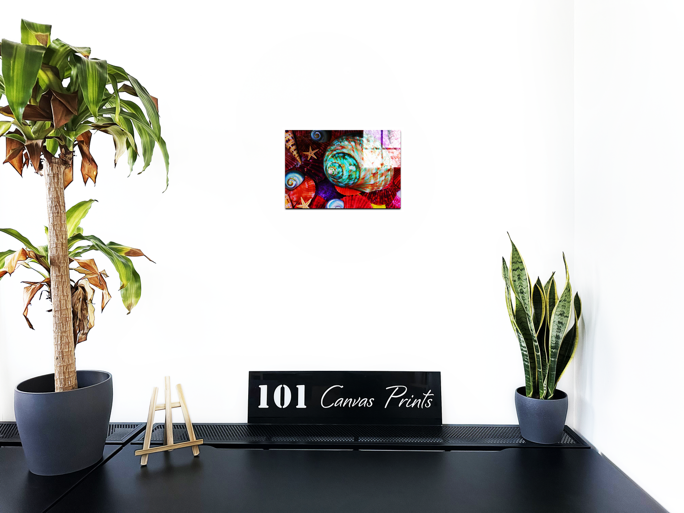 A vivid masterpiece of colour, this image features the best nature has to offer in seashells. With the magma reds and the violets of the Calico scallops, the turquoise of the Turbinidae and holography of the Nautilus shells, it really is a beach party on an Acrylic print. The vibrancy is complimented by the muted colours of the Beaded Asteroidea starfish and the Conidae shell to make this the perfect picture.