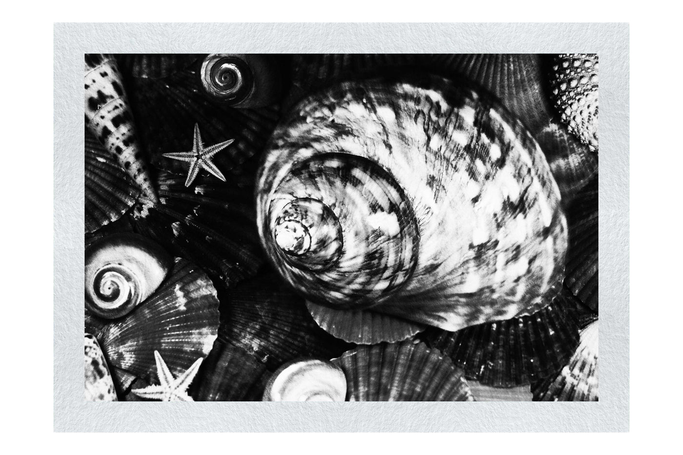 A vivid masterpiece of Monochromatic tonality, this image features the best nature has to offer in seashells. With the silvery textures of the Calico scallops, the bright light & dark tones of the Turbinidae and holography of the Nautilus shells, it really is a beach party on Fine Art paper. The vibrancy is complimented by the muted Monochrome hues of the Beaded Asteroidea starfish and the Conidae shell to make this the perfect Monochrome Fine Art print.